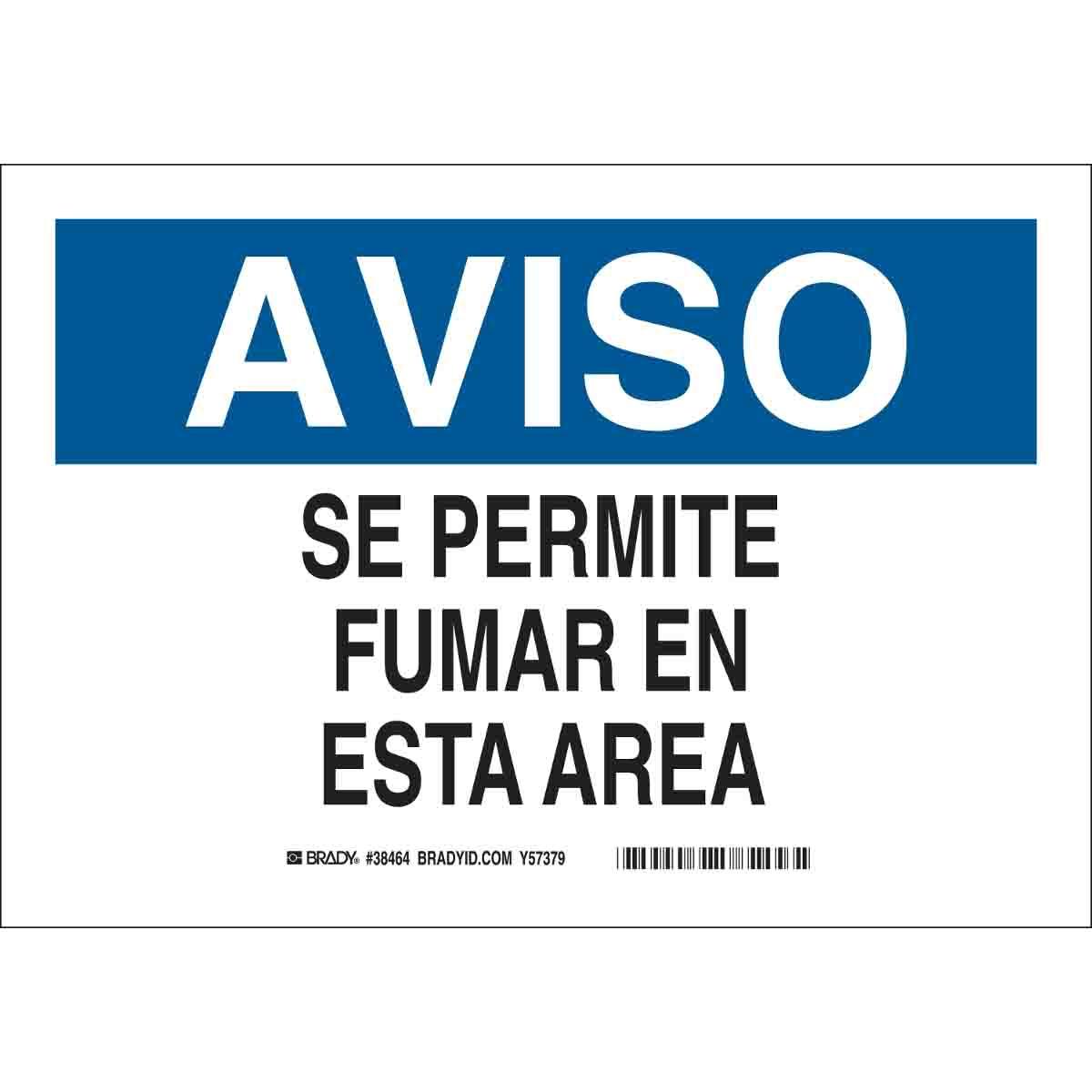 - Height:10 inLegend:AVISO SE PERMITE FUMAR EN ESTA AREALegend Style:TextLegend/Background Color:Black/Blue on WhiteMaterial:B-555 AluminumMounting Type:FastenedType:Non-Reflective RectangularWidth:14 in