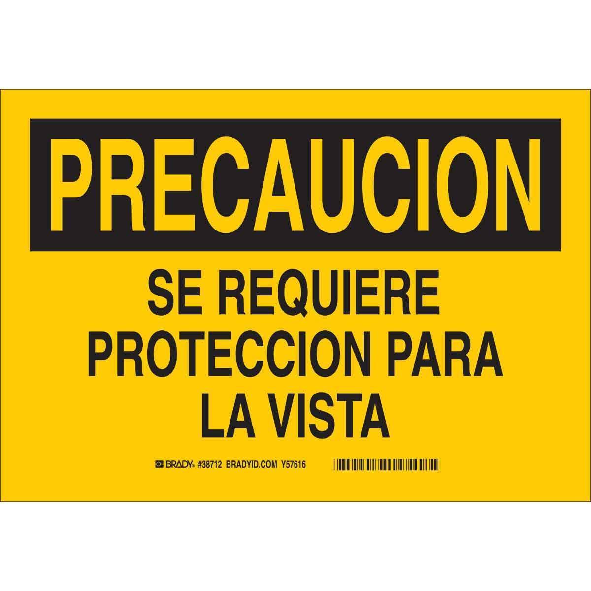 - Height:7 inLegend:PRECAUCION SE REQUIERE PROTECCION PARA LA VISTALegend Style:TextLegend/Background Color:Black on YellowMaterial:B-401 PolystyreneMounting Type:FastenedType:RectangularWidth:10 in