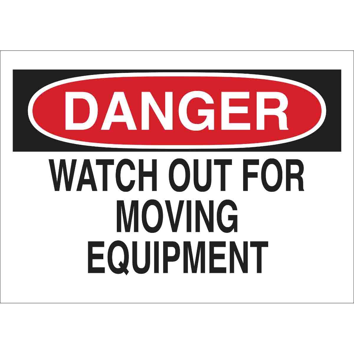 - Header:DANGERHeight:7 inLegend:WATCH OUT FOR MOVING EQUIPMENTLegend Style:TextLegend/Background Color:Black/Red on White, Red/Black on whiteMaterial:B-555 AluminumMounting Type:Corner Hole, Fastened, SurfaceType:Rectangle, RectangularWidth:10 in