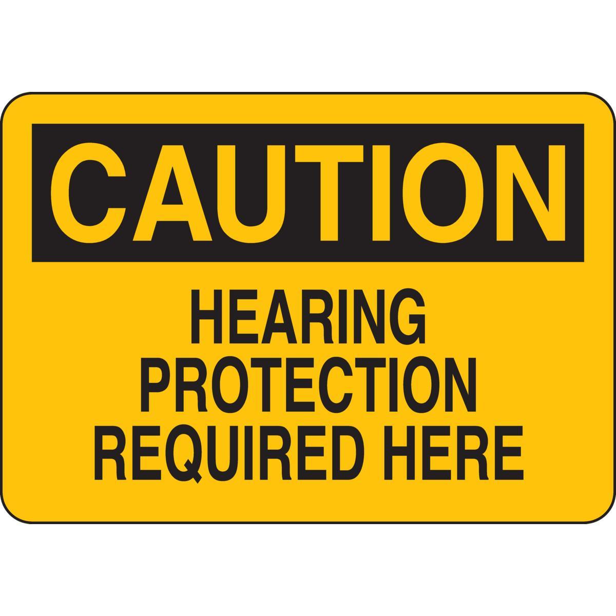 - Header:CAUTIONHeight:7 inLegend:HEARING PROTECTION REQUIRED HERELegend Style:TextLegend/Background Color:Black on YellowMaterial:B-555 AluminumMounting Type:Corner Hole, SurfaceType:Rectangle, RectangularWidth:10 in