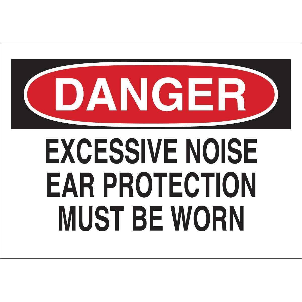 - Header:DANGERHeight:7 inLegend:EXCESSIVE NOISE EAR PROTECTION MUST BE WORNLegend Style:TextLegend/Background Color:Black/Red on WhiteMaterial:B-555 AluminumMounting Type:Corner Hole, Fastened, SurfaceType:Rectangle, RectangularWidth:10 in