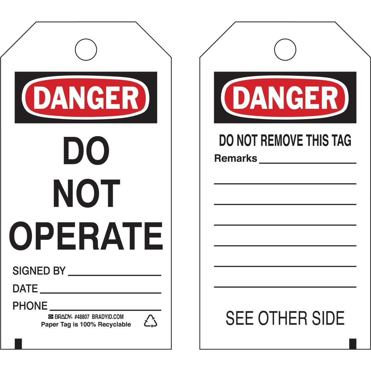- Country of Origin:USHeight:5-3/4 inLegend:Front: DANGER DO NOT OPERATE SIGNED BY:DATE Back: DANGER DO NOT REMOVE THIS TAG REMARKSLegend/Background Color:Black/Red on WhiteManufacturer Name:Brady WorldwideMaterial:B-853 CardstockType:2-Sided RectangularWidth:3 in