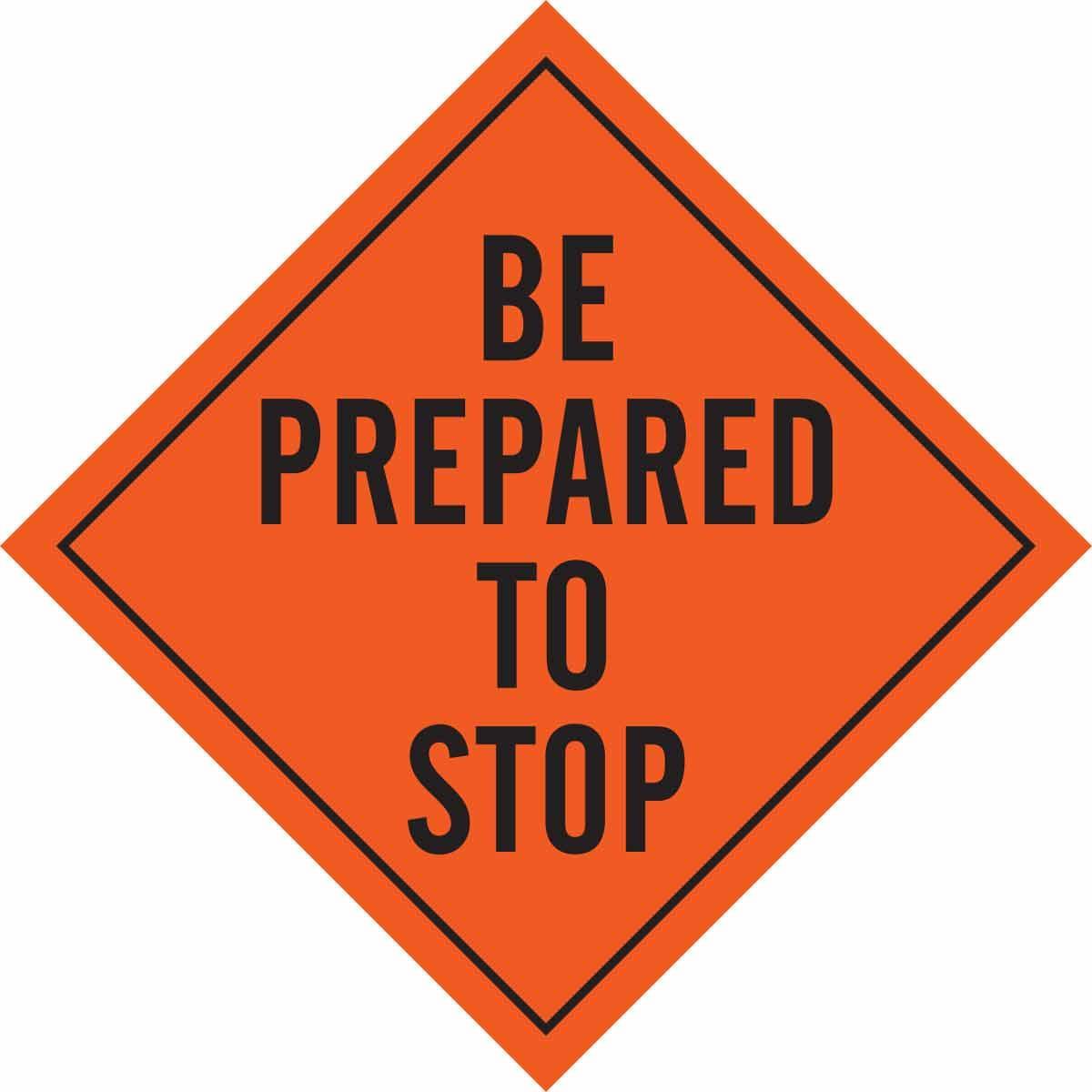 - Height:36 inLegend:BE PREPARED TO STOPLegend Style:TextLegend/Background Color:Black on OrangeMaterial:Reflective Vinyl, VinylType:DiamondWidth:36 in