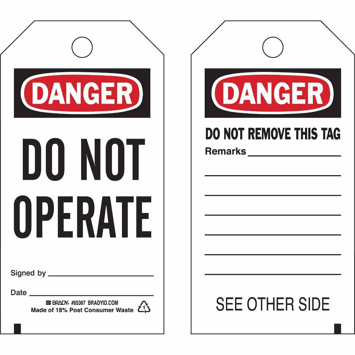 - Country of Origin:MXGrommet Type:BrassHeight:5-3/4 inHole Size:3/8 inLegend:Front: DANGER DO NOT OPERATE SIGNED BY:DATE Back: DANGER DO NOT REMOVE THIS TAG REMARKSLegend/Background Color:Black/Red on WhiteManufacturer Name:Brady WorldwideMaterial:B-851 PolyesterType:2-Sided RectangularWidth:3 inWithstand Pull Force:50 lb