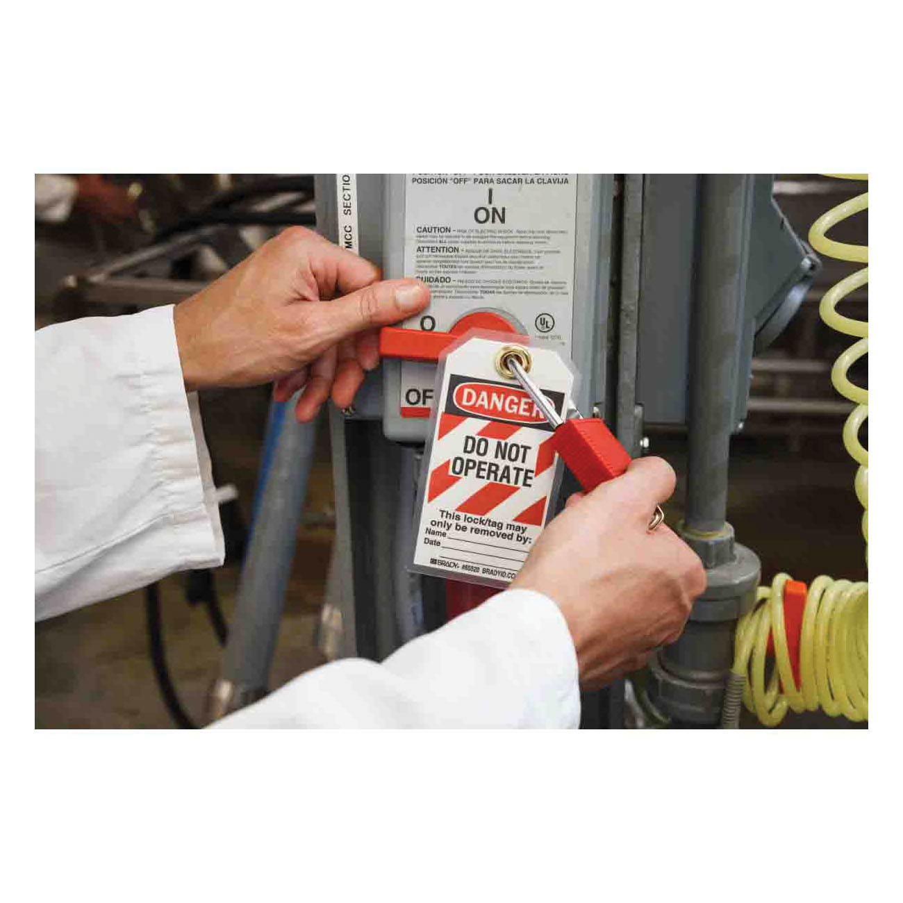 - Country of Origin:MXGrommet Type:Brass, MetalHeight:5-3/4 inHole Size:3/8 inLegend:Front: DANGER:: DO NOT OPERATE This lock/tag may only be removed by: NAME_____DATE_____ (W/DIAGONAL STRIPES)Back: This energy source has been LOCKED OUT! Unauthorized removal of this lock/tag may result in immediate discharge. REMARKS:________Legend/Background Color:Black/Red on WhiteManufacturer Name:Brady WorldwideMaterial:B-837 PolyesterType:RectangularWidth:3 inWithstand Pull Force:50 lb