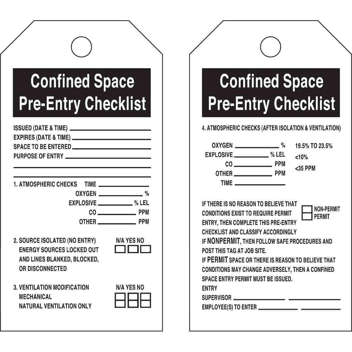 - Country of Origin:USGrommet Type:BrassHeight:5-3/4 inHole Size:3/8 inLegend:Confined Space Pre-Entry Checklist, Front: *ISSUED (DATE & TIME) *EXPIRES (DATE & TIME) *SPACE TO BE ENTERED *PURPOSE OF ENTRY ...etc, Back: 4 ATMOSPHERIC CHECKS (AFTER ISOLATION & VENTILATION) ...etcLegend/Background Color:Black on WhiteManufacturer Name:Brady WorldwideMaterial:B-837 Heavy Duty Polyester, B-837 PolyesterType:RectangularWidth:3 inWithstand Pull Force:50 lb