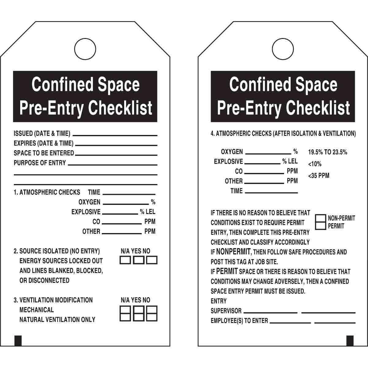 - Country of Origin:USGrommet Type:MetalHeight:5-3/4 inHole Size:3/8 inLegend:Confined Space Pre-Entry Checklist, Front: *ISSUED (DATE & TIME) *EXPIRES (DATE & TIME) *SPACE TO BE ENTERED *PURPOSE OF ENTRY ...etc, Back: 4 ATMOSPHERIC CHECKS (AFTER ISOLATION & VENTILATION) ...etcLegend/Background Color:Black on WhiteManufacturer Name:Brady WorldwideMaterial:B-851 PolyesterType:Rectangular, Rectangular Self-LaminatingWidth:3 inWithstand Pull Force:50 lb