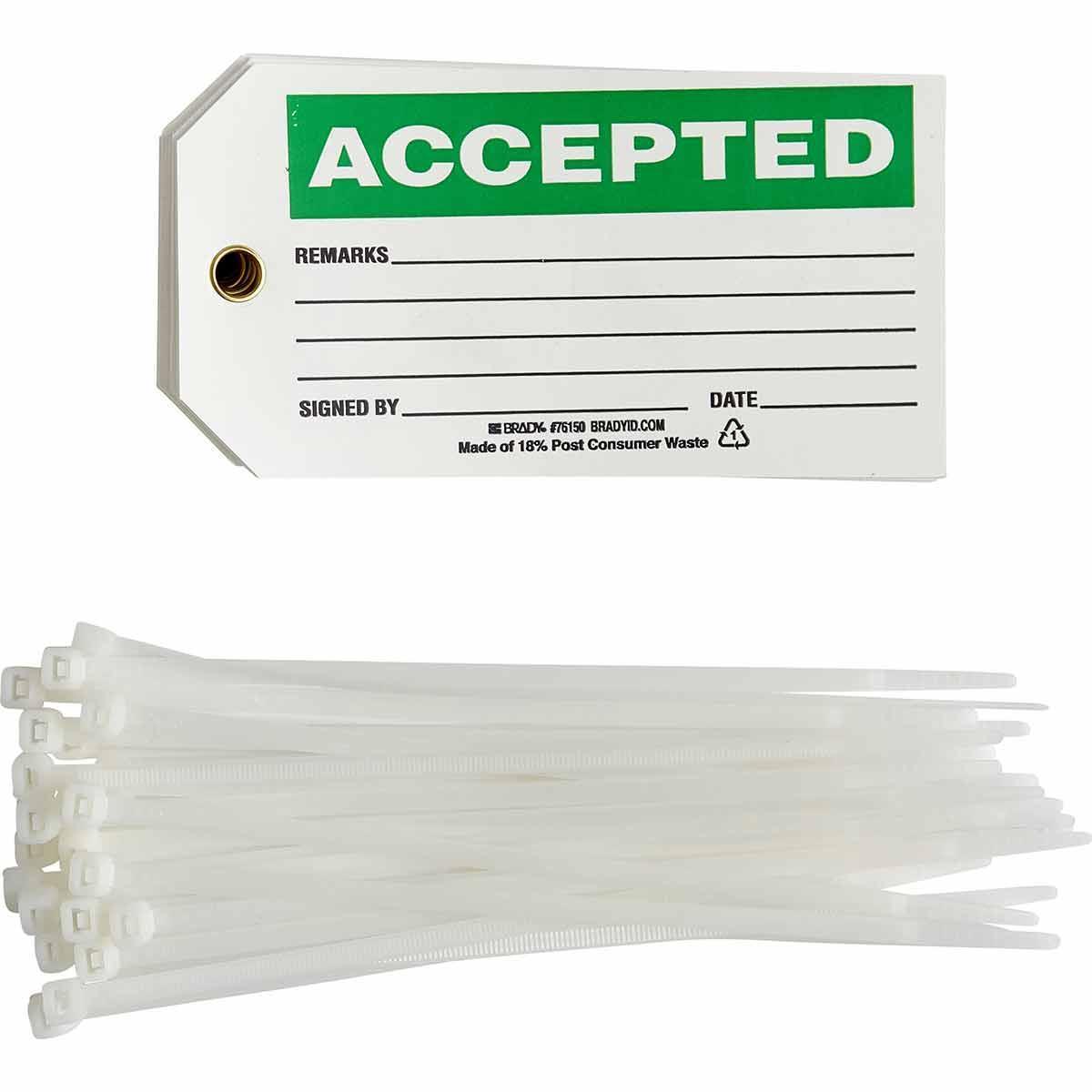 - Country of Origin:MXGrommet Type:BrassHeight:5-3/4 inHole Size:3/8 inLegend:ACCEPTED REMARKS:SIGNED BY:DATELegend/Background Color:Black/Green on WhiteManufacturer Name:Brady WorldwideMaterial:B-851 PolyesterType:1-Sided Rectangular Self-LaminatingWidth:3 inWithstand Pull Force:50 lb