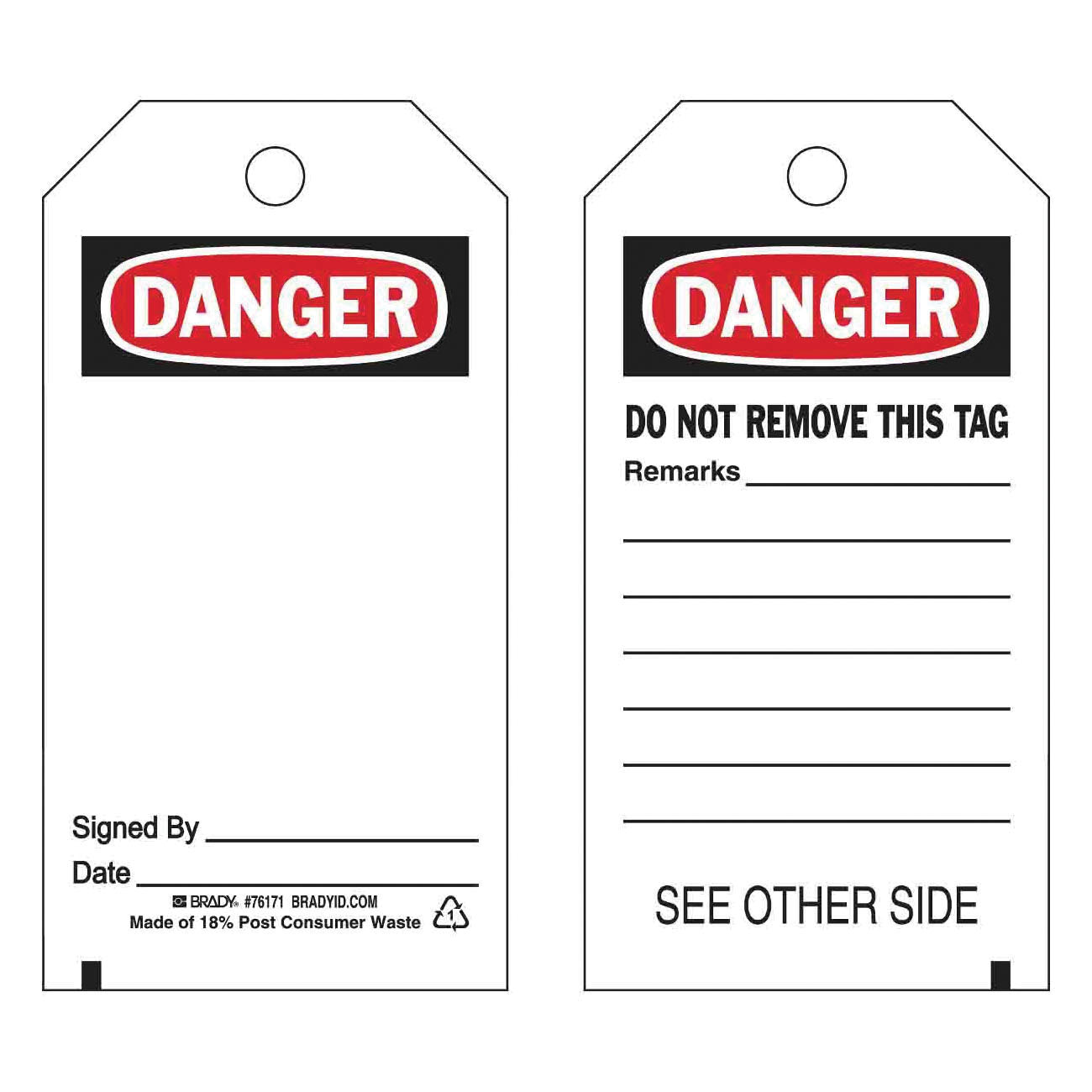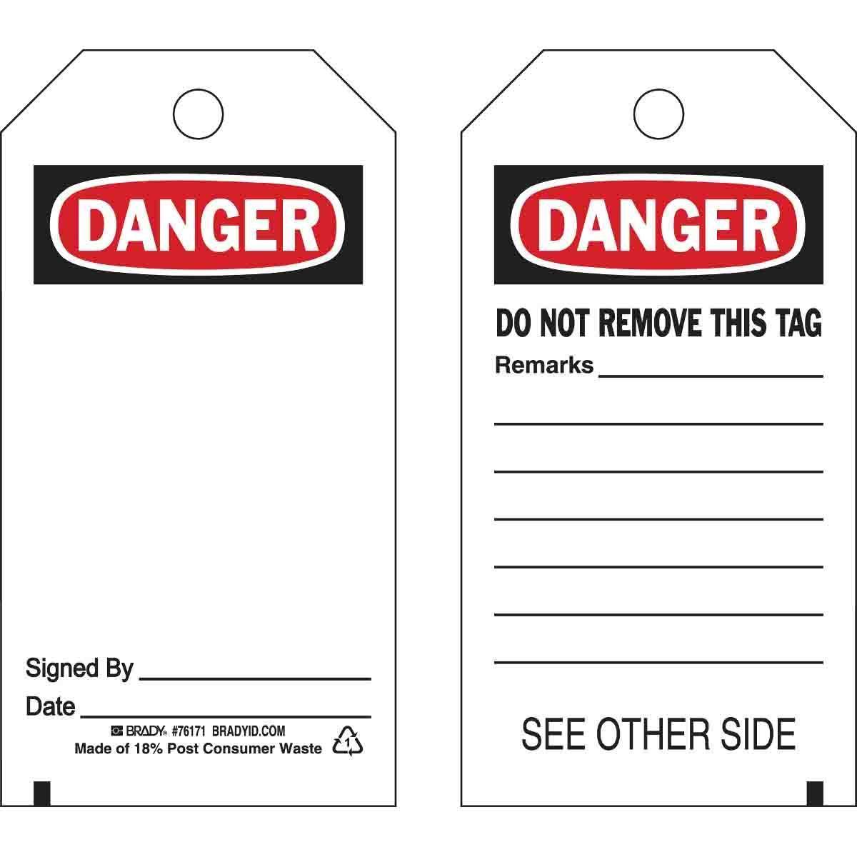 - Country of Origin:MXGrommet Type:BrassHeight:5-3/4 inHole Size:3/8 inLegend:Front: DANGER: SIGNED BY:______DATE:______Back: DO NOT REMOVE THIS TAG REMARKS:_________Legend/Background Color:Black/Red on WhiteManufacturer Name:Brady WorldwideMaterial:B-851 PolyesterType:RectangularWidth:3 inWithstand Pull Force:50 lb
