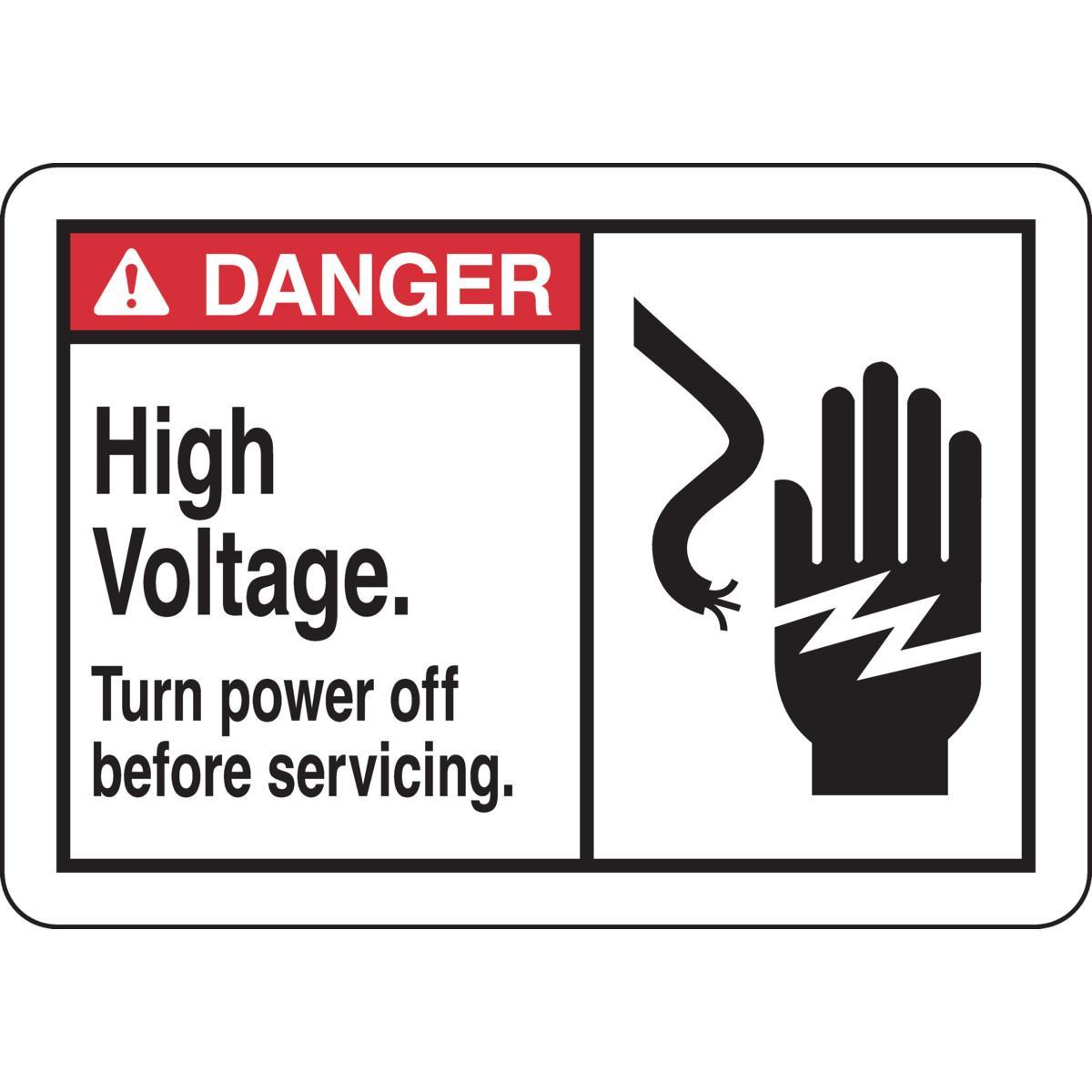 - Header:DANGERHeight:7 inLegend:DANGER HIGH VOLTAGE. TURN POWER OFF BEFORE SERVICING, HIGH VOLTAGE. TURN POWER OFF BEFORE SERVICINGLegend Style:Symbol/TextLegend/Background Color:Black/Red on WhiteMaterial:B-302 PolyesterMounting Type:Self-AdhesiveType:Laminated RectangularWidth:10 in