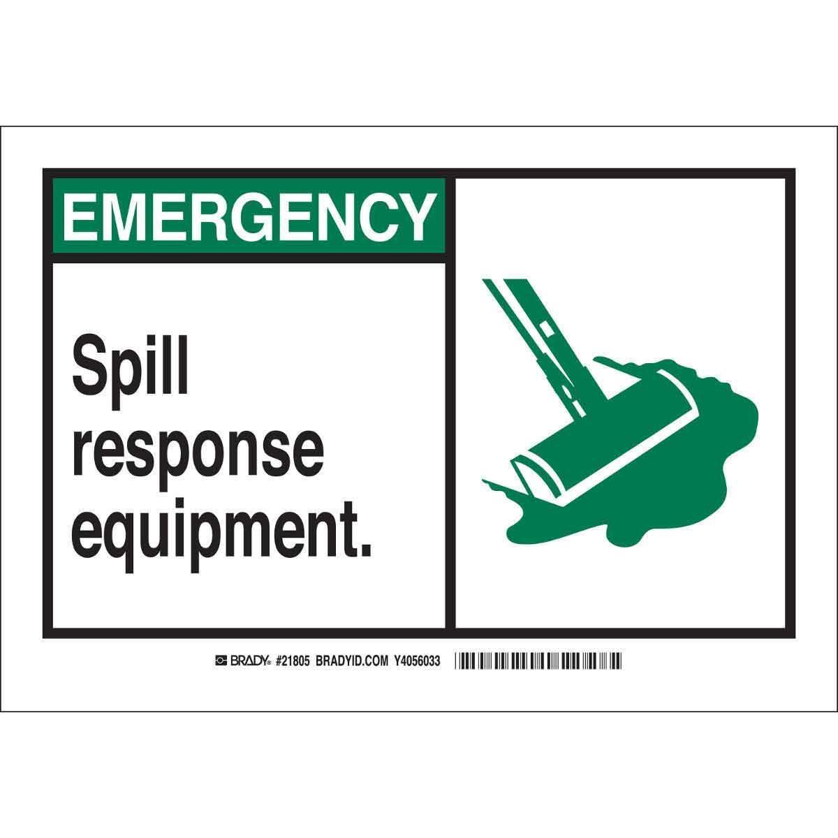 - Height:3-1/2 inLegend:EMERGENCY SPILL RESPONSE EQUIPMENTLegend Style:Symbol/TextLegend/Background Color:Black/Green on WhiteMaterial:B-302 PolyesterMounting Type:Self-AdhesiveType:OverlaminatedWidth:5 in
