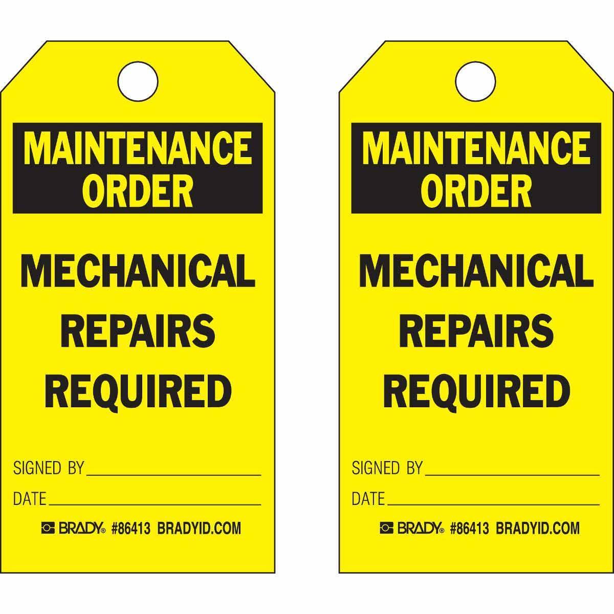 - Country of Origin:USGrommet Type:MetalHeight:5-3/4 inHole Size:3/8 inLegend:MAINTENANCE ORDER MECHANICAL REPAIRS REQUIRED SIGNED BY: DATE:Legend/Background Color:Black on YellowManufacturer Name:Brady WorldwideMaterial:B-837 Heavy Duty Polyester, B-837 PolyesterType:Laminated RectangularWidth:3 inWithstand Pull Force:50 lb