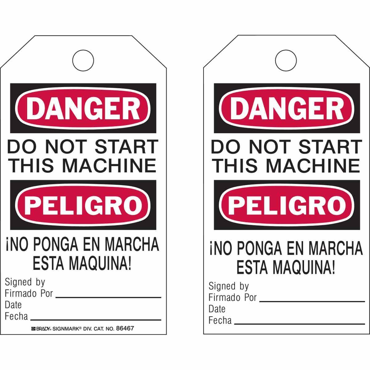- Country of Origin:USGrommet Type:MetalHeight:7 inHole Size:3/8 inLegend:DANGER/PELIGRO DO NOT START THIS MACHINE INO PONGA EN MARCHA ESTA MAQUINA! SIGNED BY FIRMADO POR: DATE FECHA:Legend/Background Color:Black/Red on WhiteManufacturer Name:Brady WorldwideMaterial:B-837 Heavy Duty Polyester, B-837 PolyesterType:Laminated RectangularWidth:4 inWithstand Pull Force:50 lb
