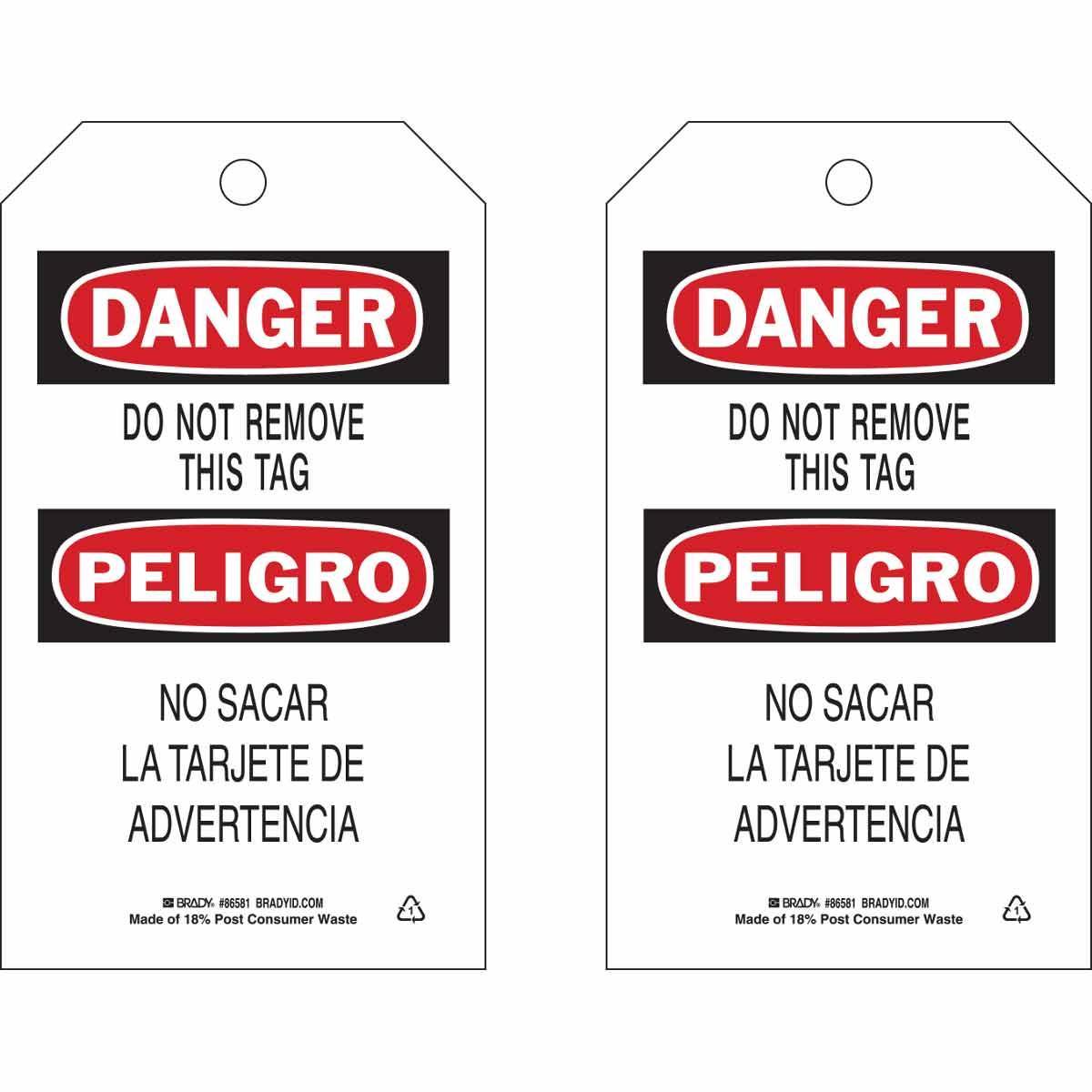 - Country of Origin:USGrommet Type:MetalHeight:7 inHole Size:3/8 inLegend:DANGER/PELIGRO DO NOT REMOVE THIS TAG NO SACAR LA TARJETA DE ADVERTENCIALegend/Background Color:Black/Red on WhiteManufacturer Name:Brady WorldwideMaterial:B-837 Heavy Duty Polyester, B-837 PolyesterType:Laminated RectangularWidth:4 inWithstand Pull Force:50 lb