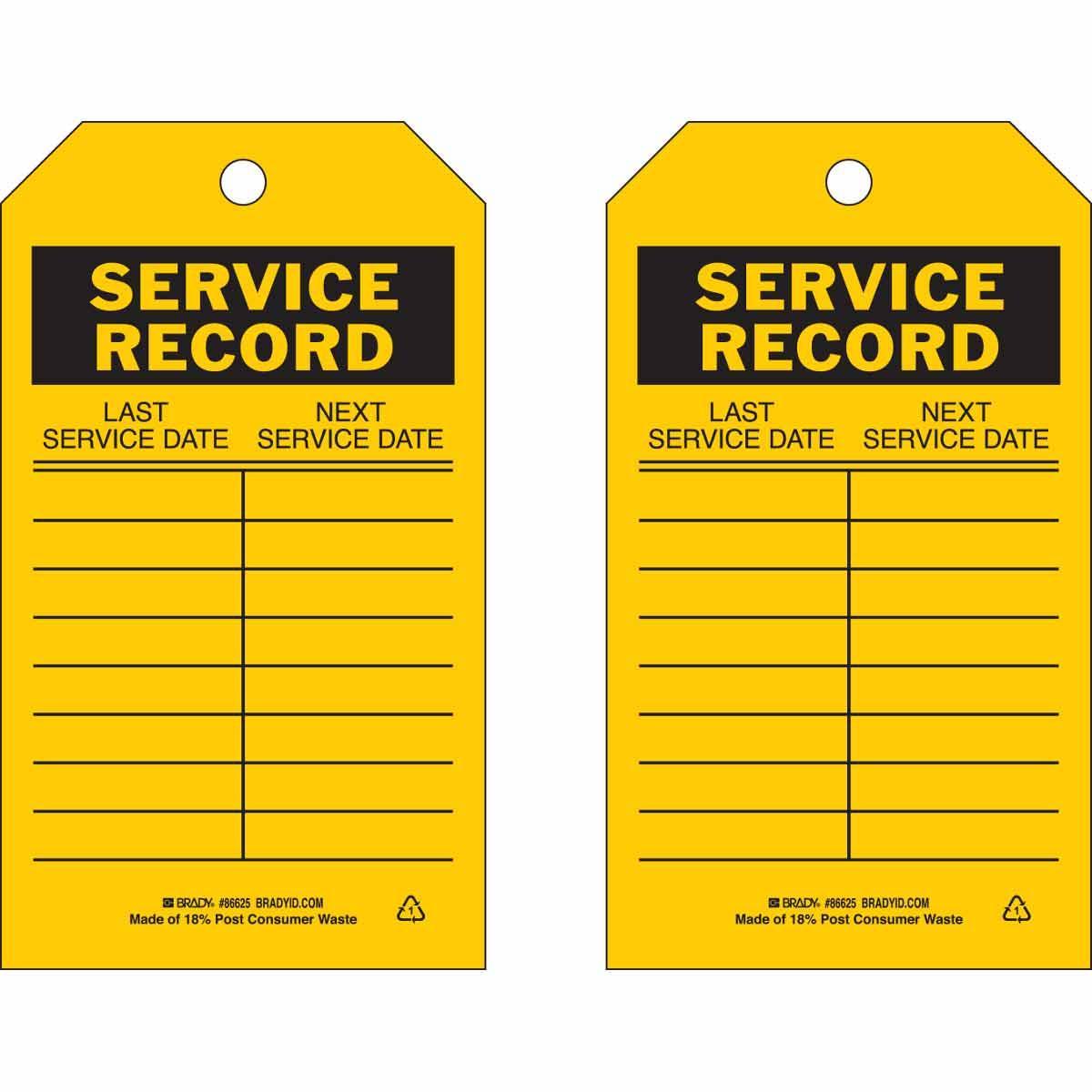 - Country of Origin:USGrommet Type:BrassHeight:7 inHole Size:3/8 inLegend:SERVICE RECORD, Front: LAST SERVICE DATE / NEXT SERVICE DATE, Back: LAST SERVICE DATE / NEXT SERVICE DATELegend/Background Color:Black on YellowManufacturer Name:Brady WorldwideMaterial:B-837 Heavy Duty Polyester, B-837 PolyesterType:RectangularWidth:4 inWithstand Pull Force:50 lb