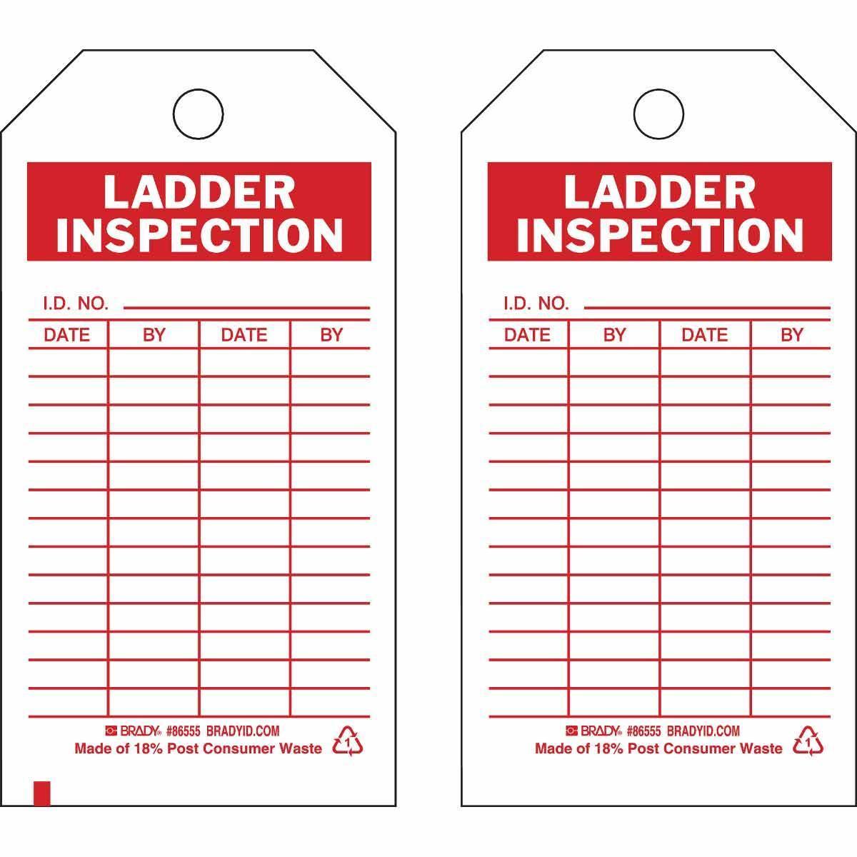 - Country of Origin:MXGrommet Type:BrassHeight:5-3/4 inHole Size:3/8 inLegend:LADDER INSPECTION I.D. NO.: DATE: BY: DATE: BY:Legend/Background Color:Red on WhiteManufacturer Name:Brady WorldwideMaterial:B-851 PolyesterType:RectangularWidth:3 inWithstand Pull Force:50 lb