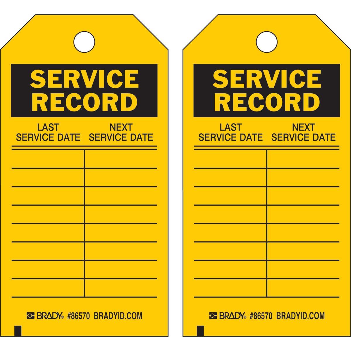 - Country of Origin:USGrommet Type:MetalHeight:5-3/4 inHole Size:3/8 inLegend:SERVICE RECORD LAST SERVICE DATE: NEXT SERVICE DATE:Legend/Background Color:Black on YellowManufacturer Name:Brady WorldwideMaterial:B-851 Economy Polyester, B-851 PolyesterType:Rectangle, RectangularWidth:3 inWithstand Pull Force:50 lb