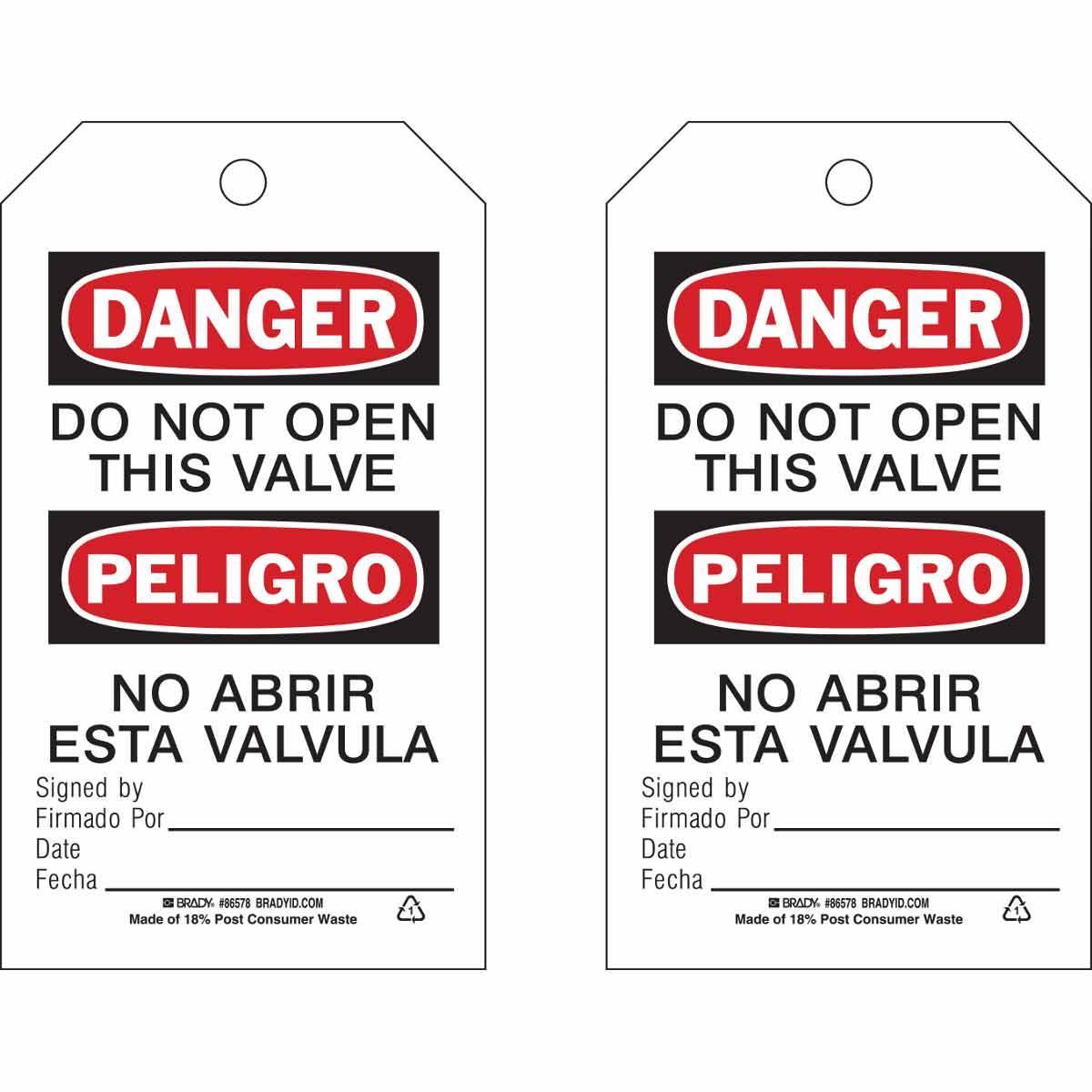 - Country of Origin:USGrommet Type:BrassHeight:7 inHole Size:3/8 inLegend:DANGER/PELIGRO DO NOT OPEN THIS VALVE NO ABRIR ESTA VALVULA SIGNED BY FIRMADO POR: DATE FECHA:Legend/Background Color:Black/Red on WhiteManufacturer Name:Brady WorldwideMaterial:B-851 PolyesterType:RectangularWidth:4 inWithstand Pull Force:50 lb