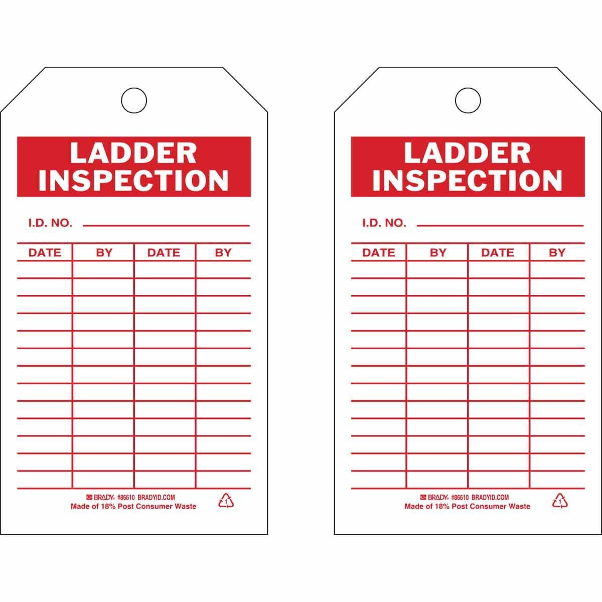 - Country of Origin:USGrommet Type:BrassHeight:7 inHole Size:3/8 inLegend:LADDER INSPECTION I.D. NO.: DATE: BY: DATE: BY:Legend/Background Color:Red on WhiteManufacturer Name:Brady WorldwideMaterial:B-851 PolyesterType:RectangularWidth:4 inWithstand Pull Force:50 lb