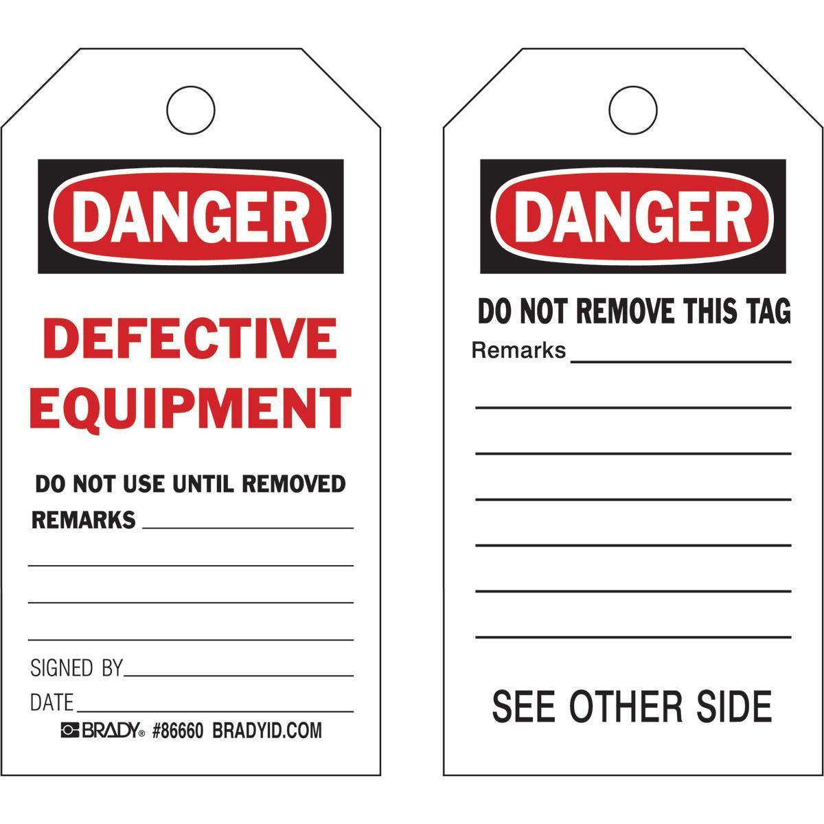 - Country of Origin:USGrommet Type:BrassHeight:5-3/4 inHole Size:3/8 inLegend:DANGER DEFECTIVE EQUIPMENT DO NOT USE UNTIL REMOVED REMARKS: SIGNED BY: DATE:/DO NOT REMOVE THIS TAG REMARKS:, Front: DANGER DEFECTIVE EQUIPMENT DO NOT USE UNTIL REMOVED REMARKS:SIGNED BY:DATE, Back: DANGER DO NOT REMOVE THIS TAG REMARKSLegend/Background Color:Black/Red on WhiteManufacturer Name:Brady WorldwideMaterial:B-853 CardstockType:2-Sided Rectangular Write-OnWidth:3 in