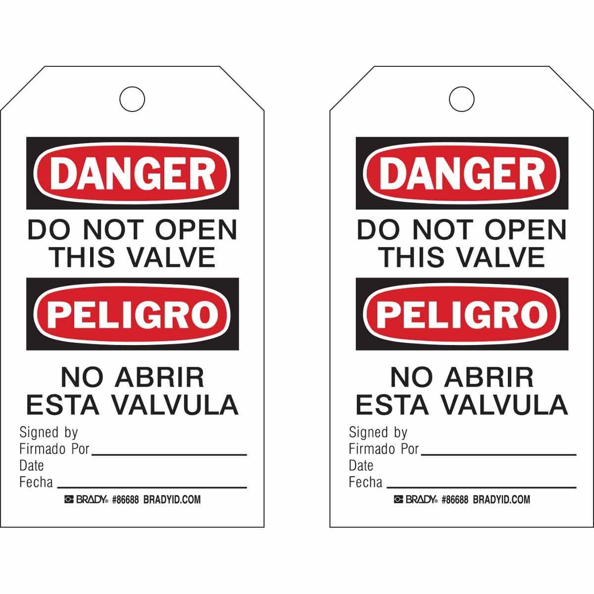 - Country of Origin:USHeight:7 inHole Size:3/8 inLegend:DANGER/PELIGRO DO NOT OPEN THIS VALVE NO ABRIR ESTA VALVULA SIGNED BY FIRMADO POR: DATE FECHA:Legend/Background Color:Black/Red on WhiteManufacturer Name:Brady WorldwideMaterial:B-853 CardstockType:RectangularWidth:4 in