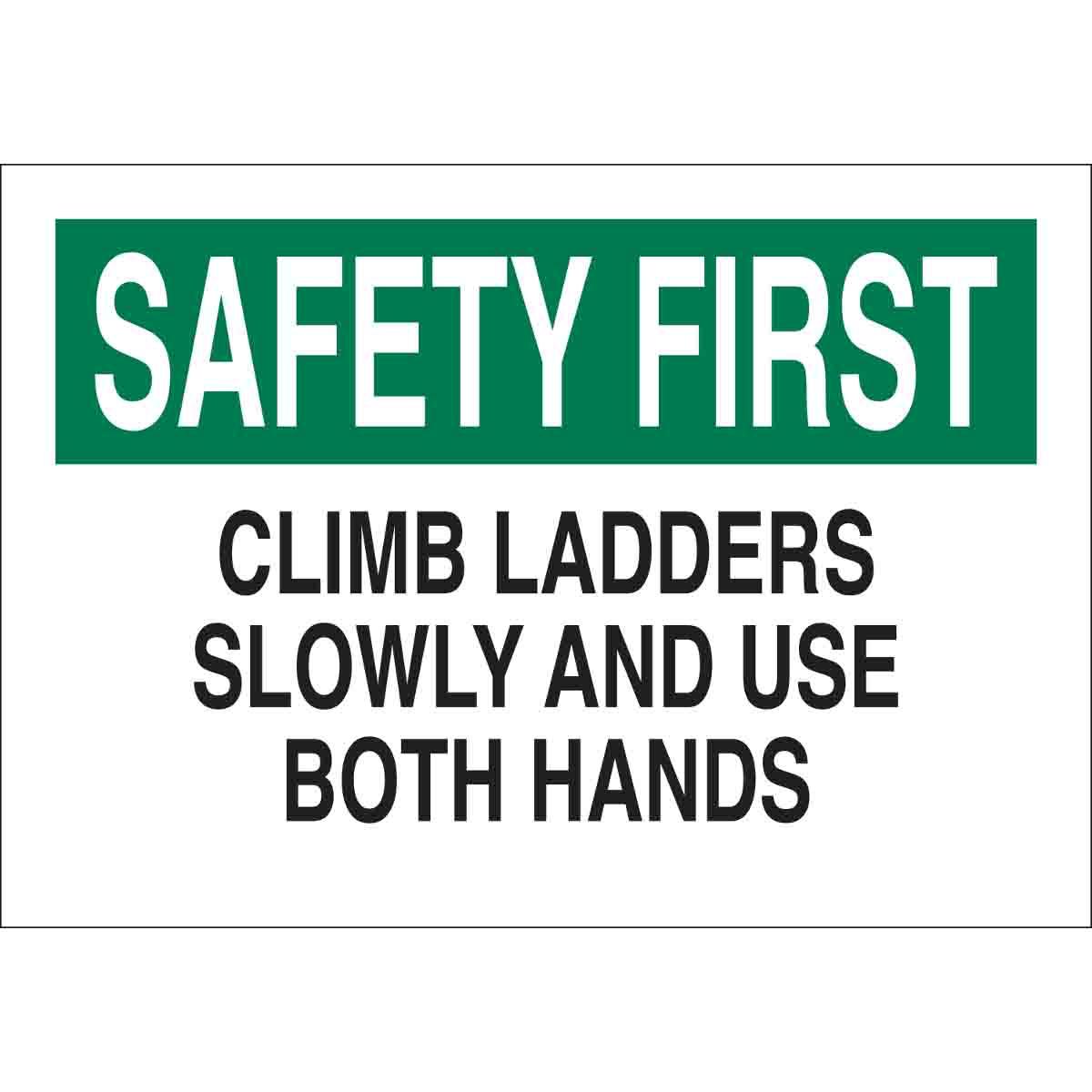 - Height:10 inLegend:SAFETY FIRST CLIMB LADDERS SLOWLY AND USE BOTH HANDSLegend Style:TextLegend/Background Color:Black/Green on WhiteMaterial:B-302 PolyesterMounting Type:Adhesive, Self-AdhesiveType:Laminated RectangularWidth:14 in