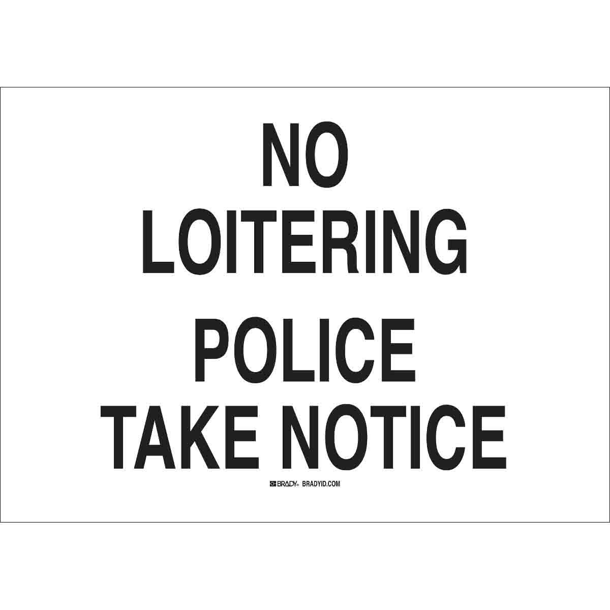 - Header:No HeaderHeight:14 inLegend:NO LOITERING POLICE TAKE NOTICELegend Style:TextLegend/Background Color:Black on WhiteMaterial:B-120 Fiberglass, B-120 Premium FiberglassMounting Type:Corner Hole/Surface, Fastened, SurfaceType:Rectangle, RectangularWidth:20 in