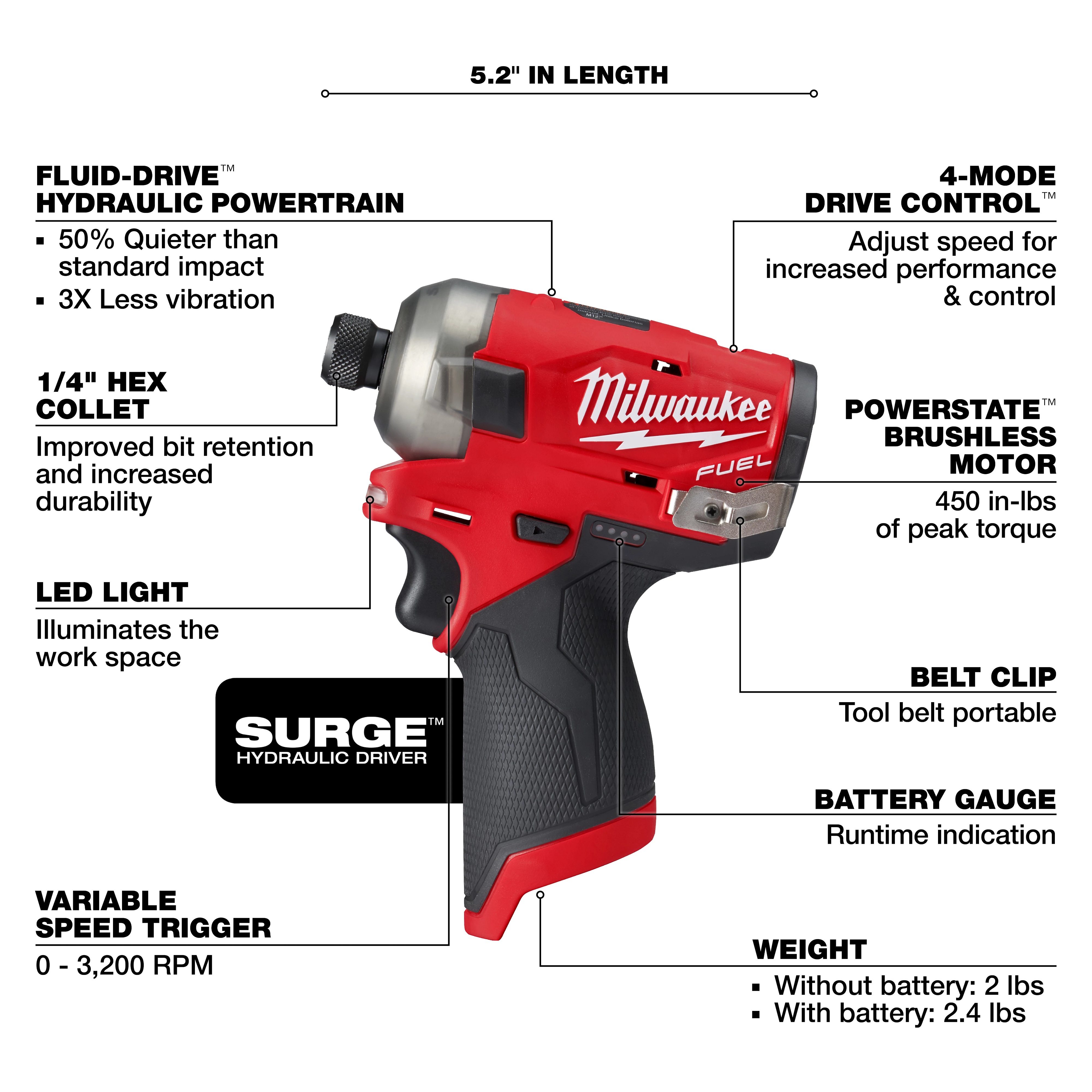 Milwaukee M12 FUEL SURGE 2551-20 Cordless Hydraulic Driver, 1/4 in Hex Drive, 3400 bpm, 450 in-lb Torque, 12 V, 5.2 in OAL