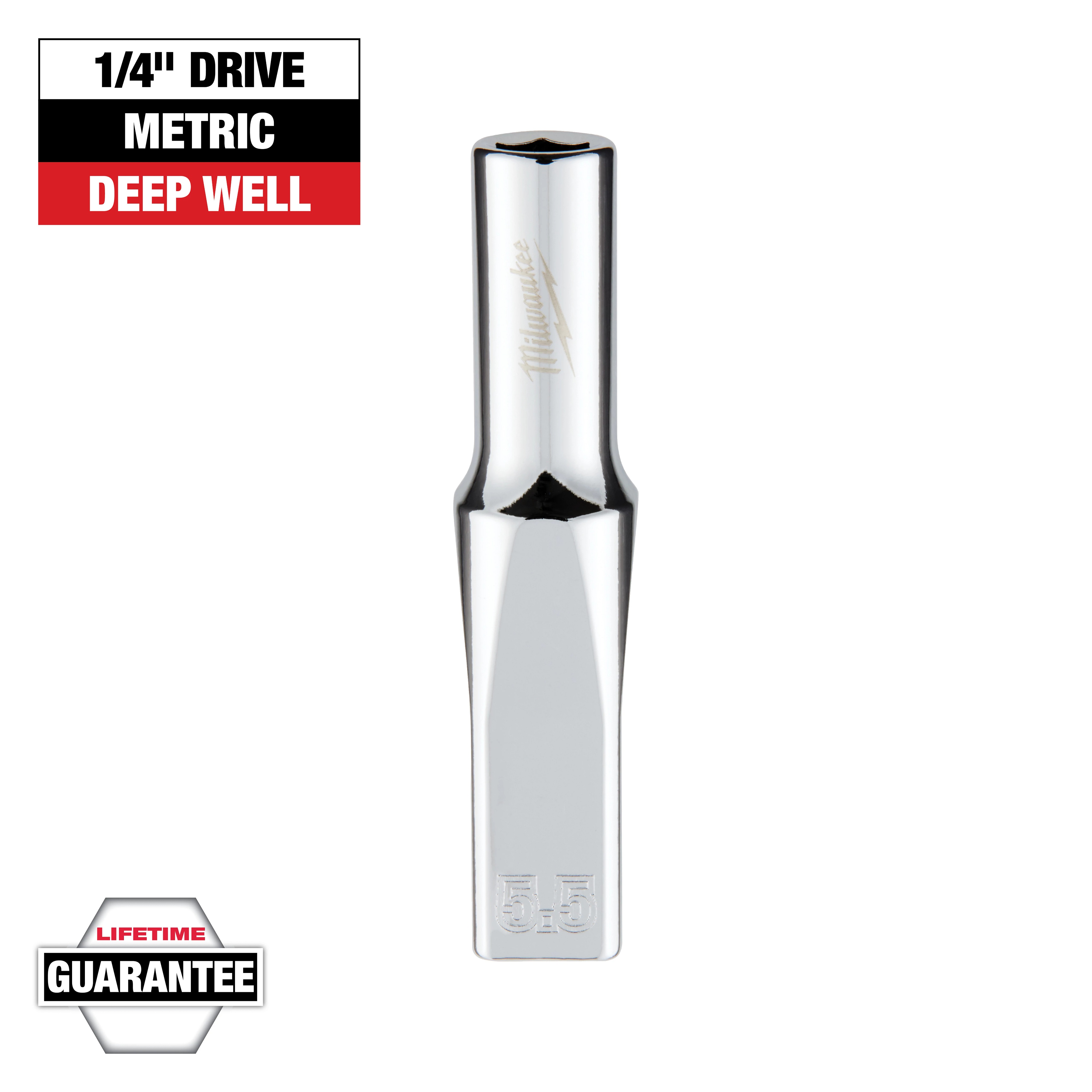 - Country of Origin:CNDrive Size:1/4 inFinish:Polished ChromeManufacturer Name:Milwaukee ToolMaterial:SteelMeasurement System:MetricNumber of Points:6Socket Size:5.5 mmSocket Type:Deep