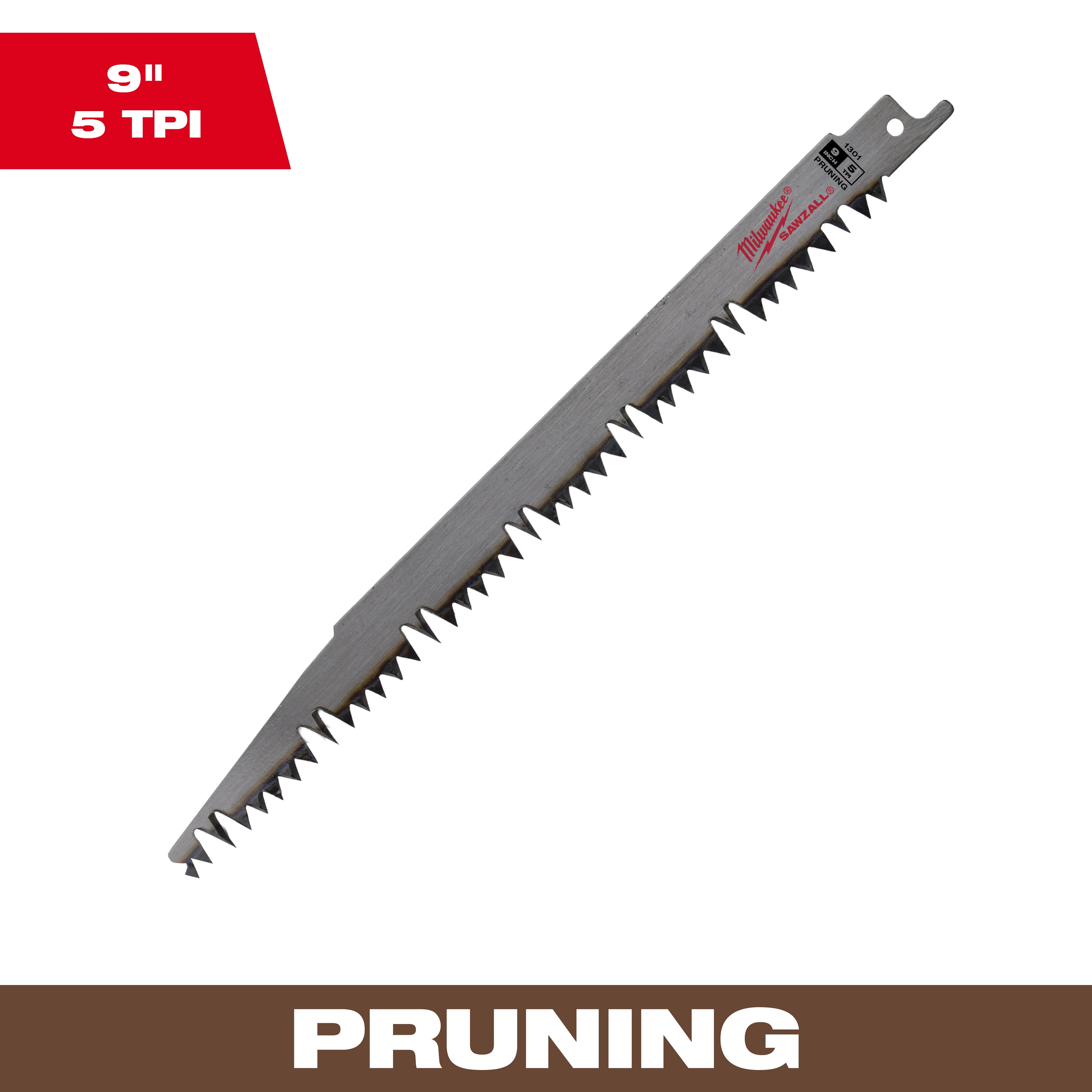 Milwaukee® SAWZALL® Reciprocating Saw Blade, 9 in Length, 3/4 in Width, 0.049 in Thickness, 5 TPI, Fleam Ground Teeth, 1/2 in Tang, Universal/Toothed Edge Tang, HSS Cutting Edge, Steel Body, Bright, White, Applicable Materials: Wood