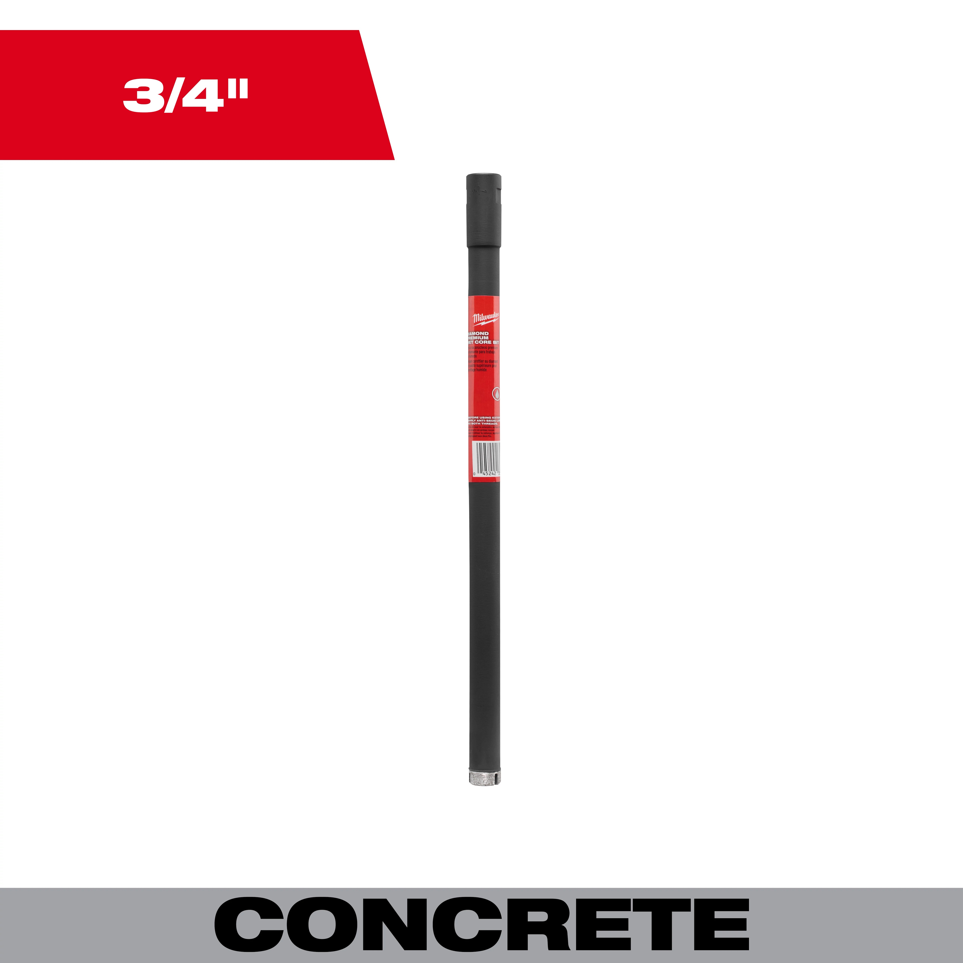 Milwaukee® Wet Core Bit, Premium Grade, 3/4 in Drill - Fraction, 0.75 in Drill - Decimal Inch, 15 in Overall Length, 15 in Cutting Depth, Diamond Cutting Edge, Applicable Materials: Concrete, Hard Aggregate, Masonry and Medium Steel Reinforcement