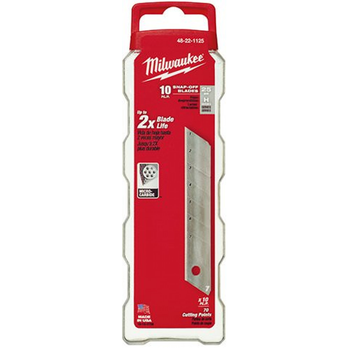Milwaukee® Utility Knife Blade, 10-Piece General Purpose, Snap-Off Blade Style, 7 in Blade Length, 25 mm Blade Width, 0.027 in Thickness, 7 Points, Compatible With: Milwaukee® Most Standard Utility Knives, Micro Carbide Metal