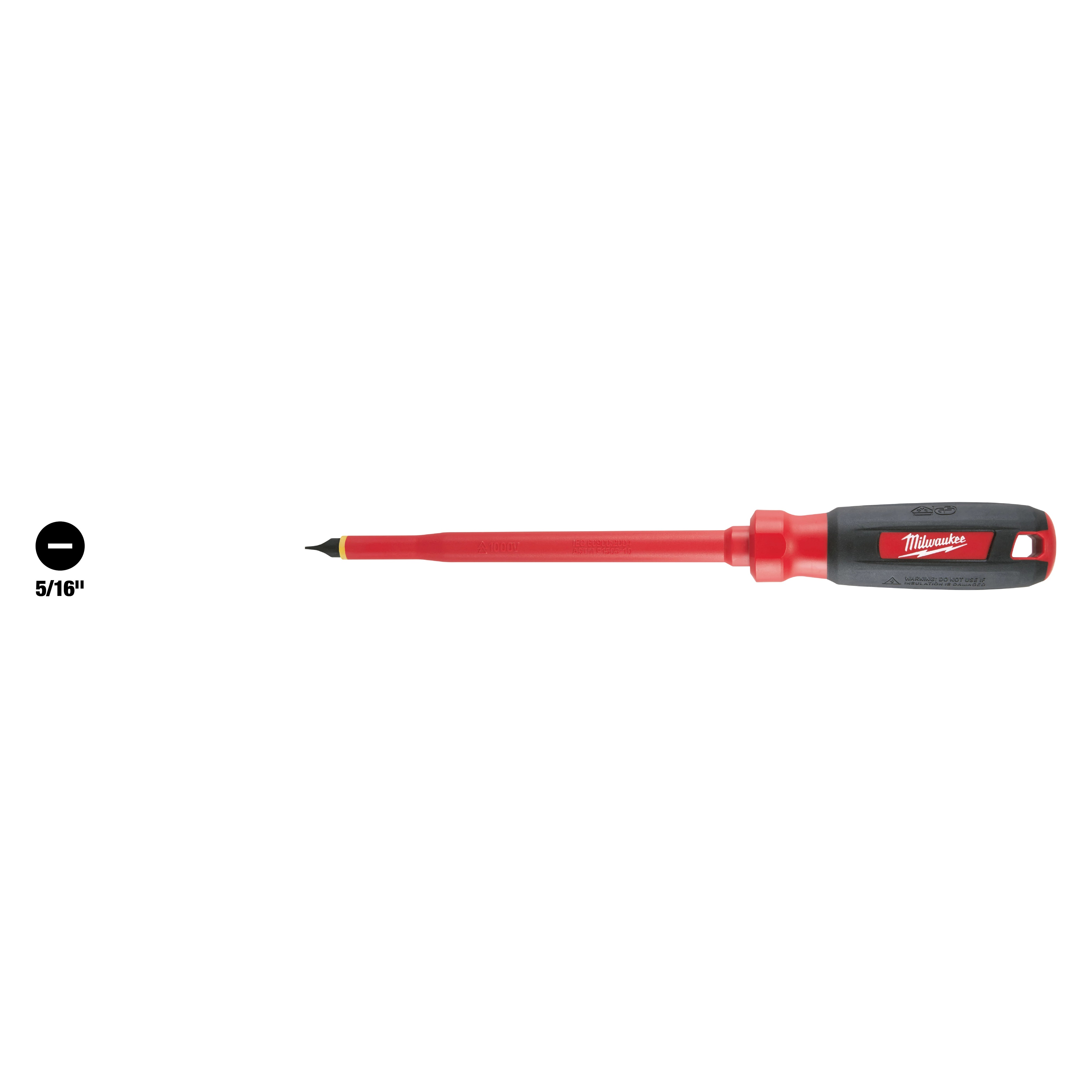 Milwaukee® Screwdriver, Measurement System: Imperial, Slotted Point, 5/16 in Point, 11 in Overall Length, 6 in Shank Length, Steel Shank, Specifications Met: ASTM F1505-10, Yes, Plastic/Rubber Handle, Steel, Black/Red