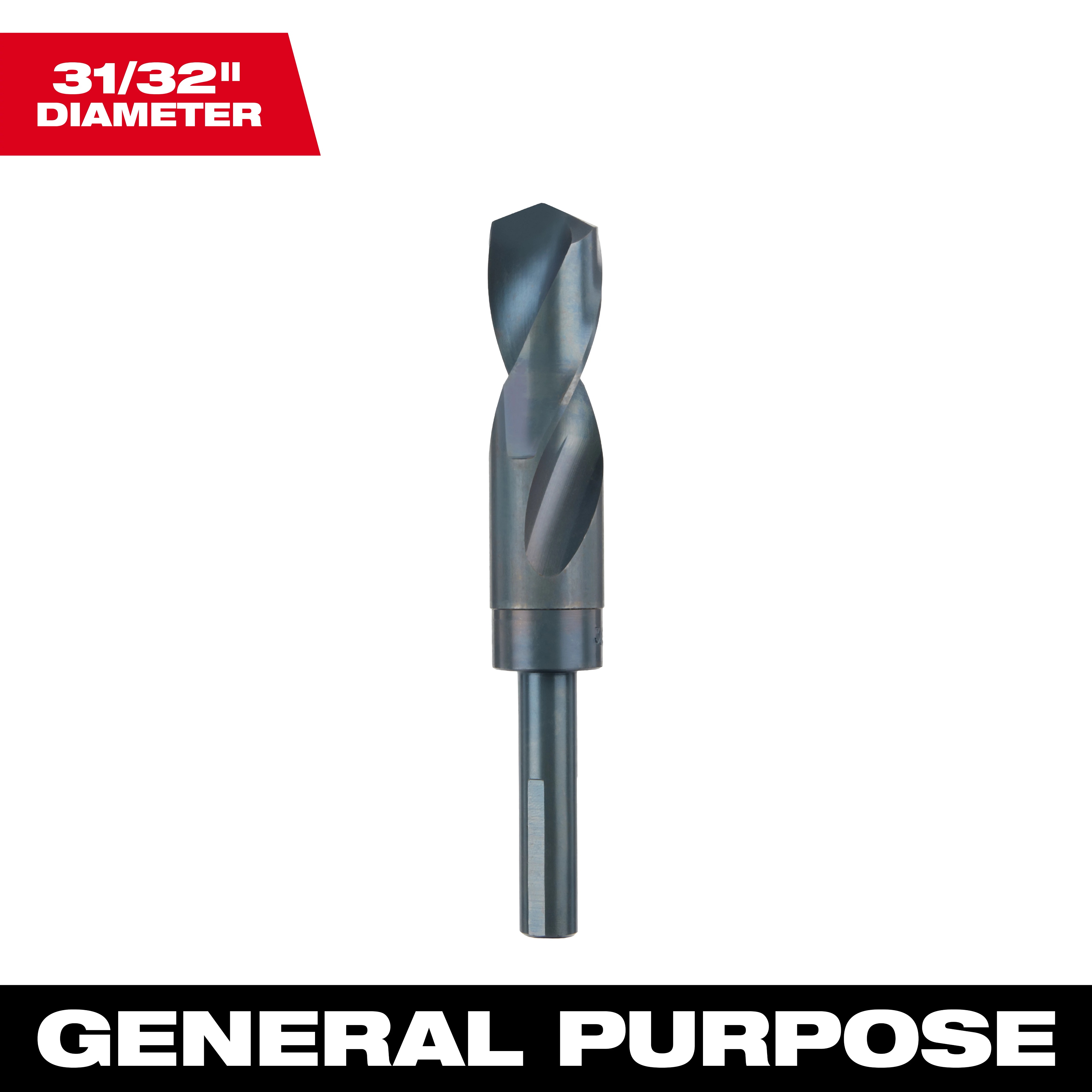 Milwaukee® Silver and Deming Drill Bit, 31/32 in Drill - Fraction, 0.9688 in Drill - Decimal Inch, 6 in Overall Length, Parabolic Flute, 3 in Flute Length, 1/2 in Shank, 3-Flat/Reduced Shank, 135 deg Point, Split Point, HSS Cutting Edge, HSS, Black Oxide, Applicable Materials: Metal, Plastic and Wood