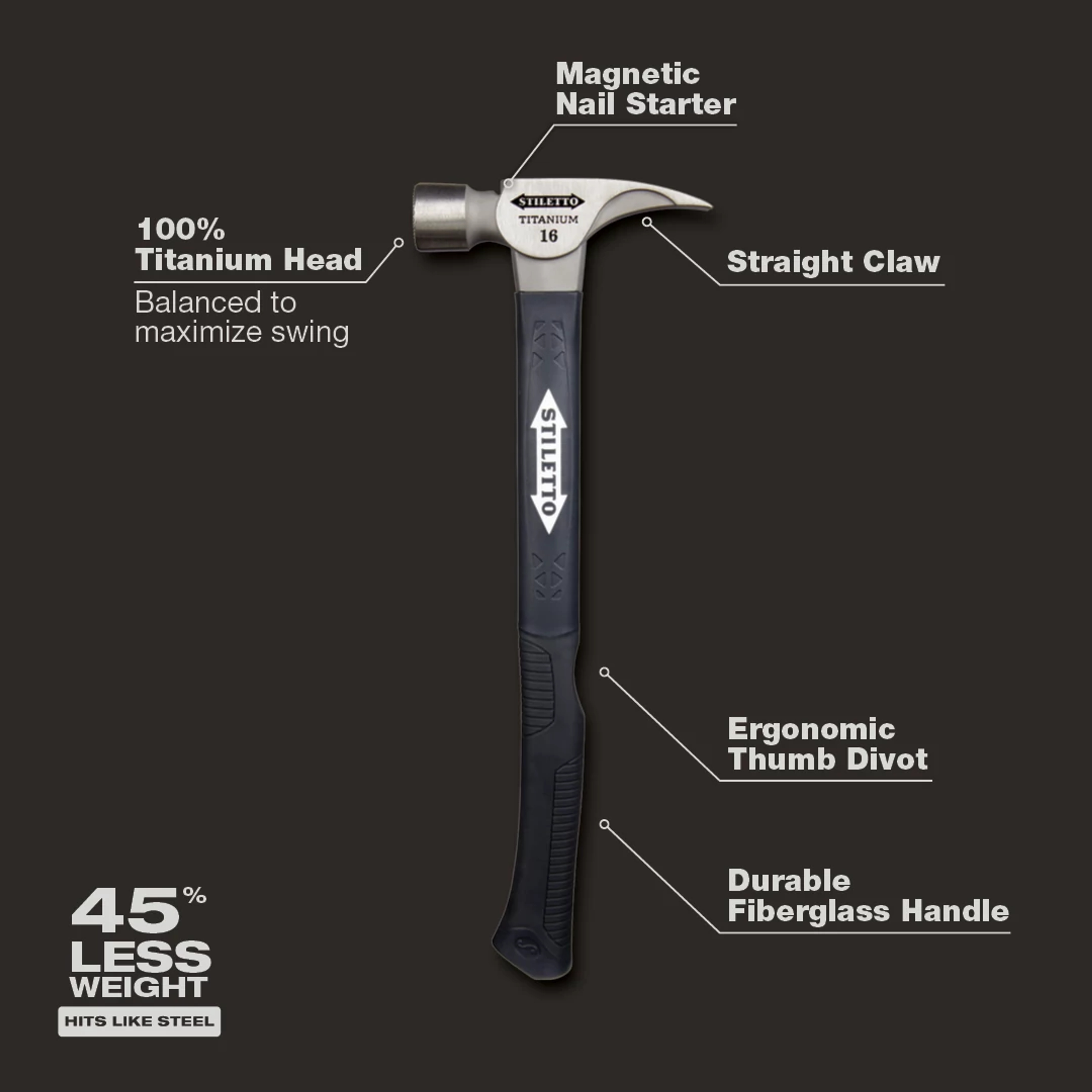 - Claw Style:StraightFace Diameter:2 inFace Surface:MilledFace Type:MilledGrip Type:Ergonomic/Non-SlipHandle Material:FiberglassHandle Type:CurvedHead Length:6 inHead Material:TitaniumHead Weight:16 ozOverall Length:18 inType:Nailing