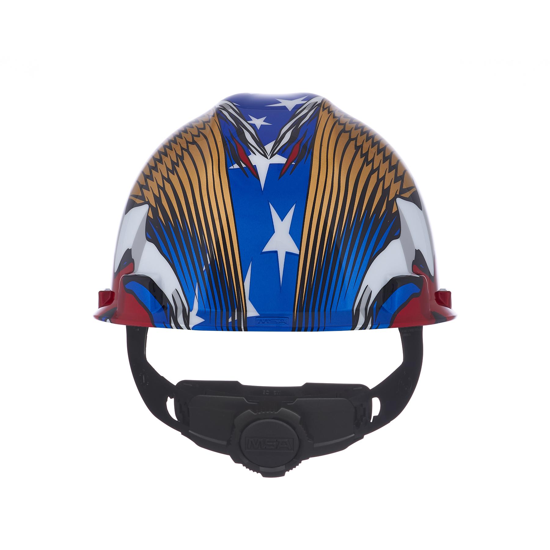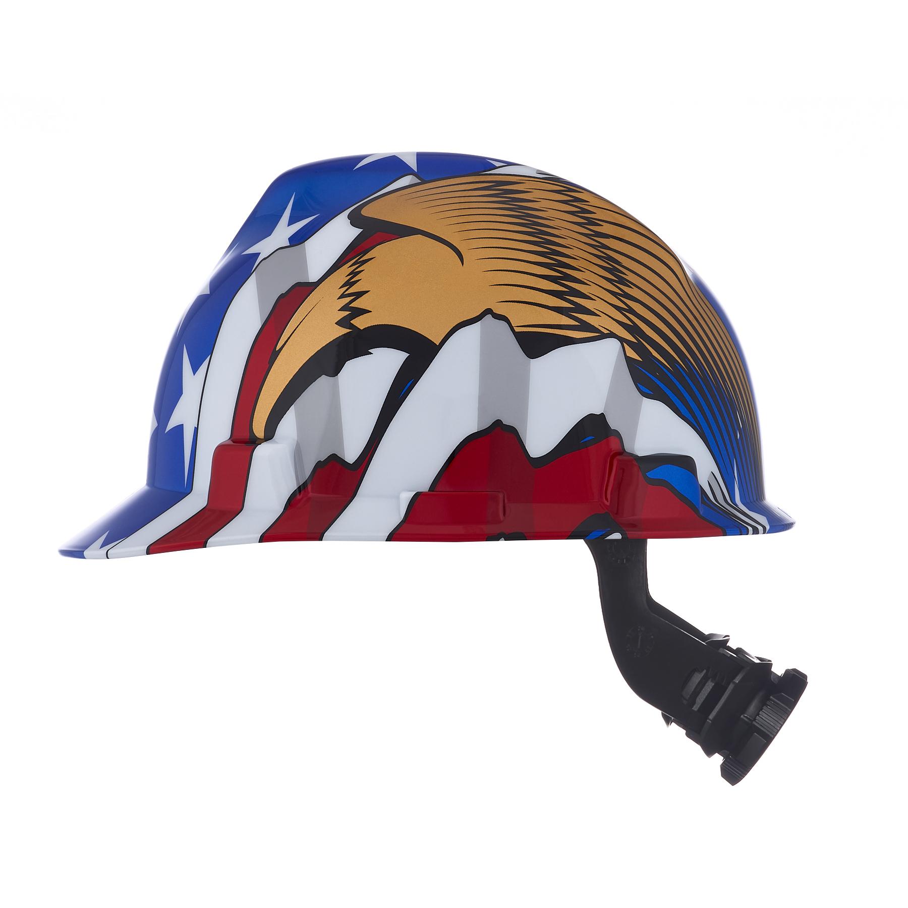 MSA V-Gard 10052947 Hard Hat, 6-1/2 Fits Mini Hat, 8 Fits Max Hat, Polyethylene, 4-Point Fas-Trac III Suspension, ANSI Electrical Class Rating: Class E, ANSI Impact Rating: Type I, American Flag with 2 Eagles Graphics, Ratchet Adjustment