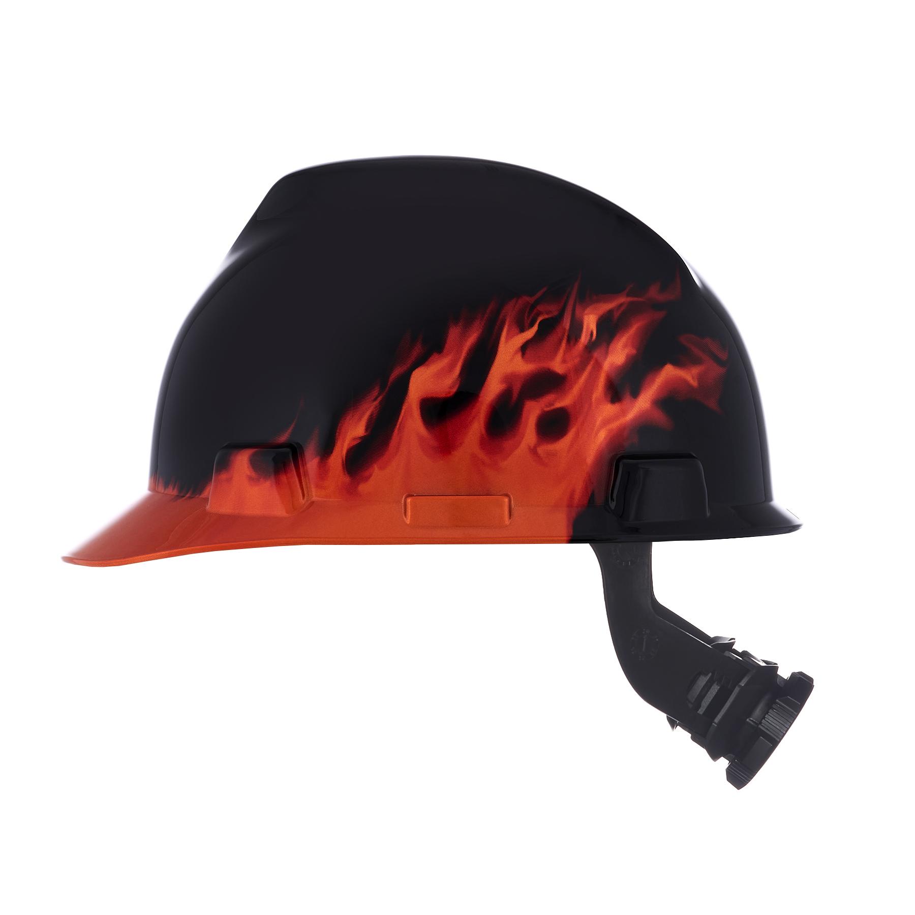 MSA V-Gard 10092015 Hard Hat, 6-1/2 Fits Mini Hat, 8 Fits Max Hat, Polyethylene, 4-Point Fas-Trac III Suspension, ANSI Electrical Class Rating: Class E, ANSI Impact Rating: Type I, Black Fire Graphics, Ratchet Adjustment