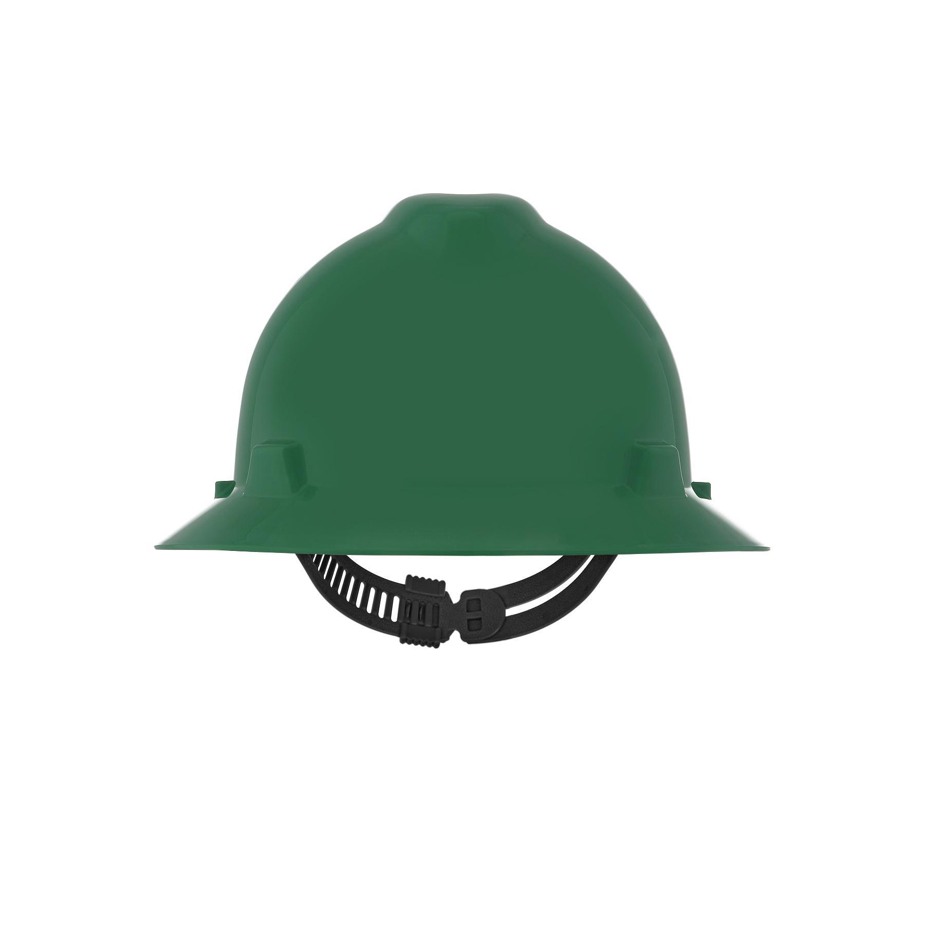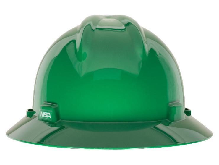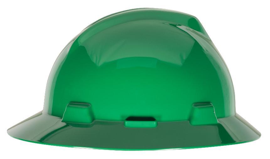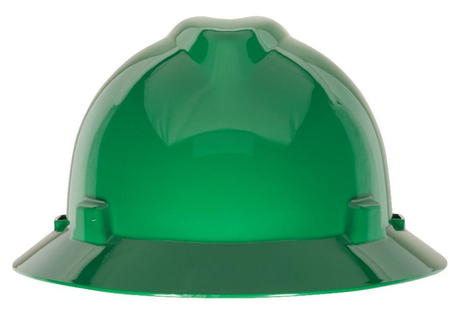 MSA V-Gard® Hard Hat, Full Brim, Standard Size, Fits Minimum Hat Size: 6-1/2, Fits Maximum Hat Size: 8, Green, Polyethylene, 4-Point Staz-On® Suspension, ANSI Electrical Class Rating: Class E, ANSI Impact Rating: Type I, Slotted: Yes, Pin Lock Adjustment