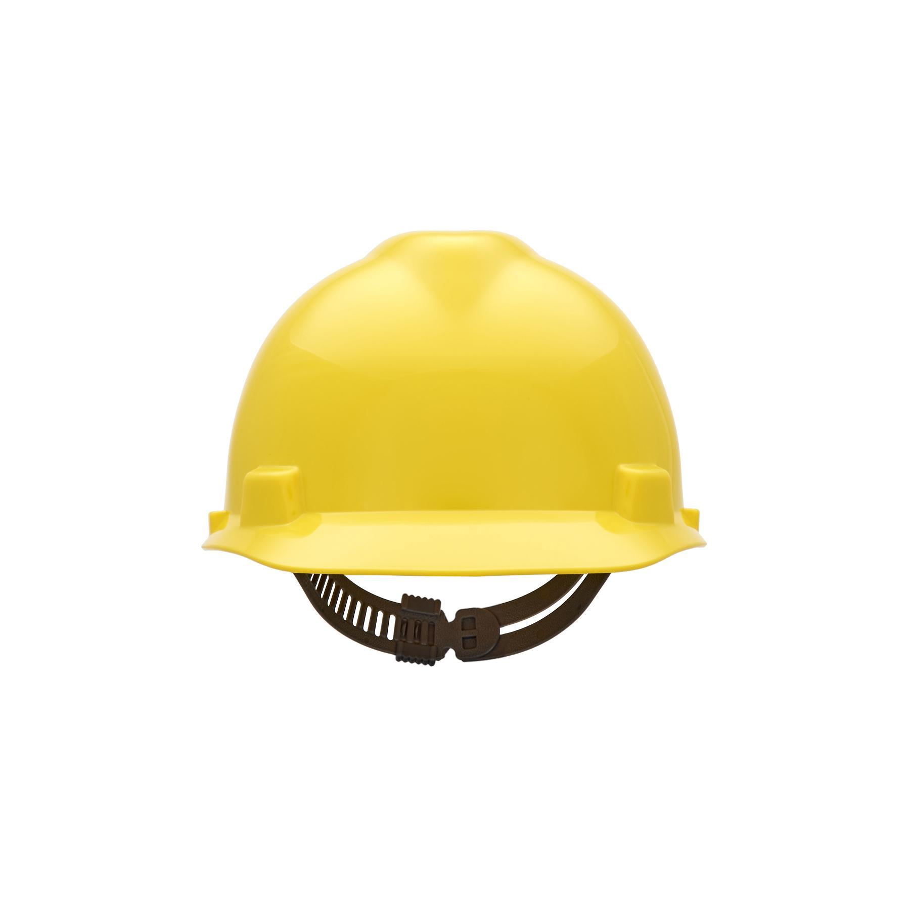 MSA V-Gard® Hard Hat, Front Brim, S Size, Fits Minimum Hat Size: 6, Fits Maximum Hat Size: 7-1/8, Yellow, Polyethylene, 4-Point Staz-On® Suspension, ANSI Electrical Class Rating: Class E, ANSI Impact Rating: Type I, Slotted: Yes, Pin Lock Adjustment