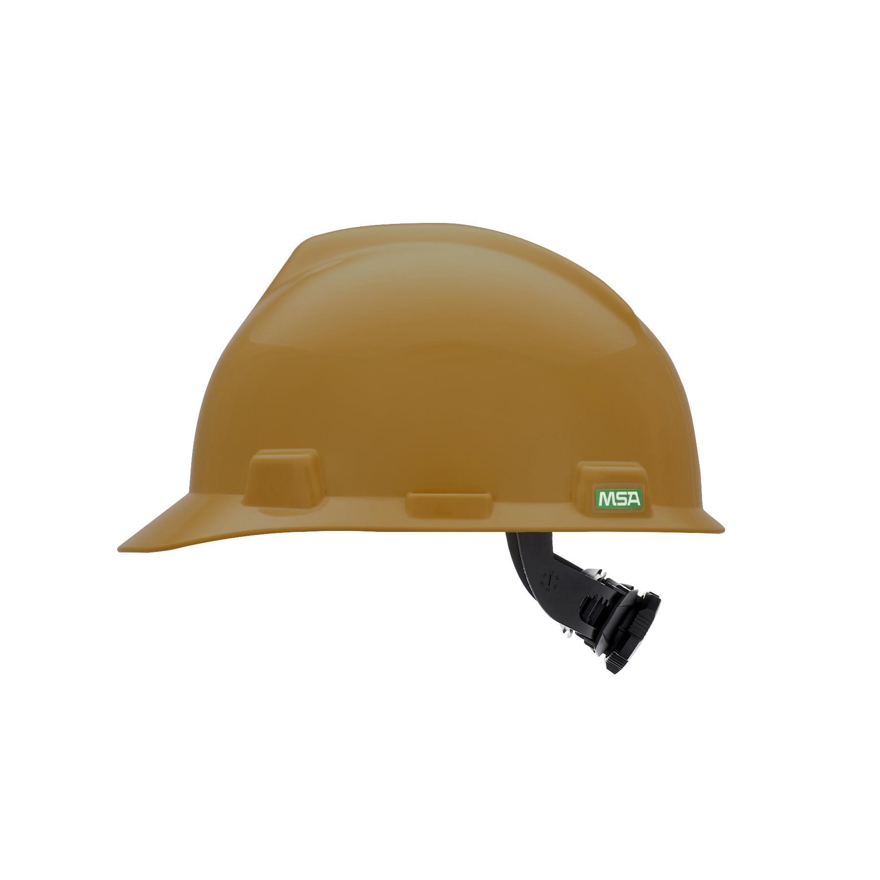 MSA V-Gard 475365 Front Brim Hard Hat, 6-1/2 Fits Mini Hat, 8 Fits Max Hat, Polyethylene, 4-Point Fas-Trac III Suspension, ANSI Electrical Class Rating: Class E, ANSI Impact Rating: Type I, Ratchet Adjustment