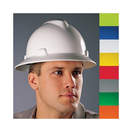 MSA V-Gard 475368 Full Brim Hard Hat, SZ 6-1/2 to 8 Fits Mini Hat, Polyethylene, 4-Point Fas-Trac III Suspension, ANSI Electrical Class Rating: Class E, ANSI Impact Rating: Type I, Ratchet Adjustment