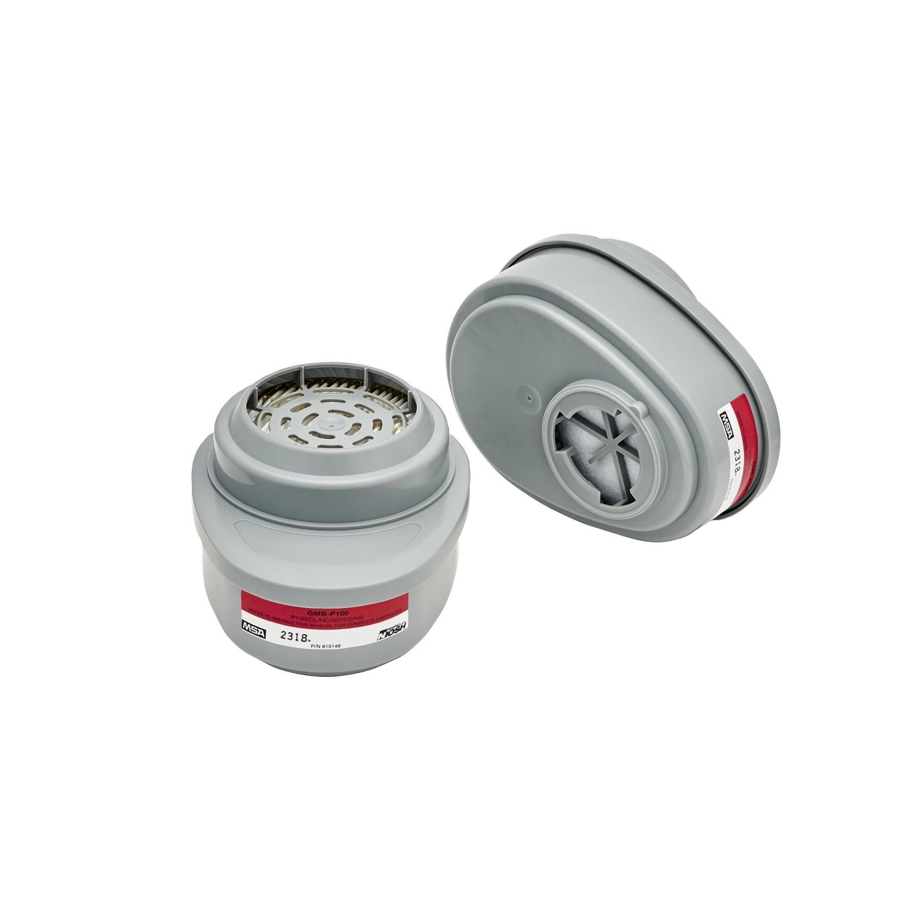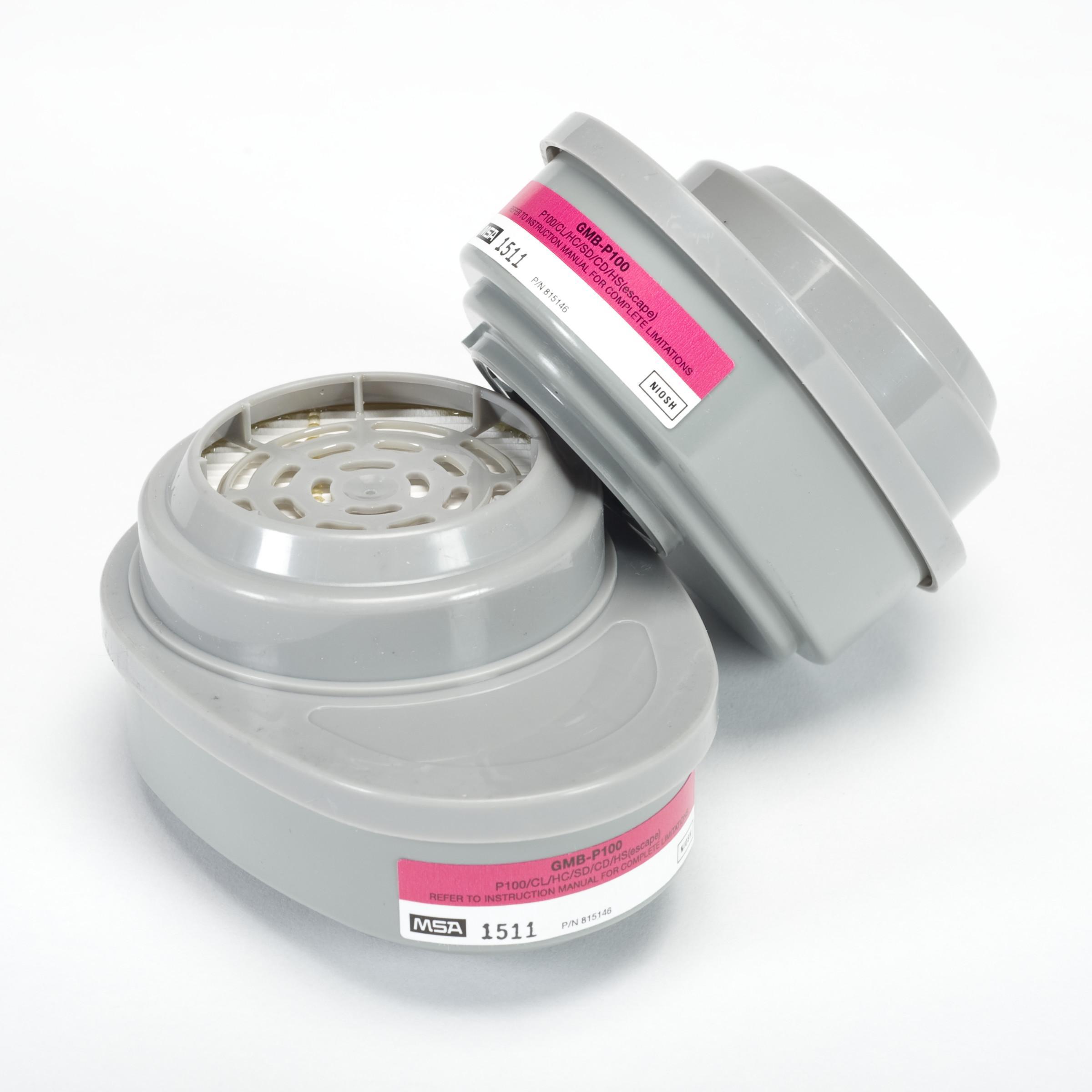 MSA 815363 Advantage Respirator Cartridge, For Use With Advantage Series Respirators, P100 Filter Class, 0.999 Filter Efficiency, Bayonet Connection, Resists: Chlorine, Chlorine Dioxide, Hydrogen Chloride, Hydrogen Sulfide and Sulfur Dioxide
