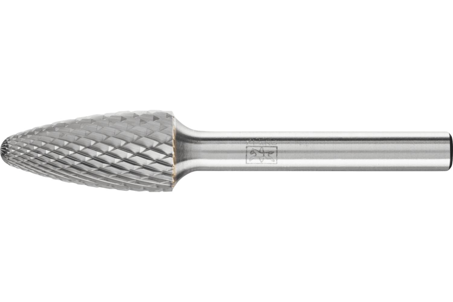 PFERD Carbide Burr, Premium Grade, Series: Universal Line, Radius, 1/2 in Head Dia, 1 in Length of Cut, 2-3/4 in Overall Length, Tree Head Shape, Double Cut Type, 1/4 in Shank Dia, 1-3/4 in Shank Length, Tungsten Carbide Head, Bright Head Coating, 24000 rpm Maximum, Applicable Materials: Cast Iron, Cast Steel, Non-Ferrous Metals, Steel and Stainless Steel, SF-5 Industry Specification