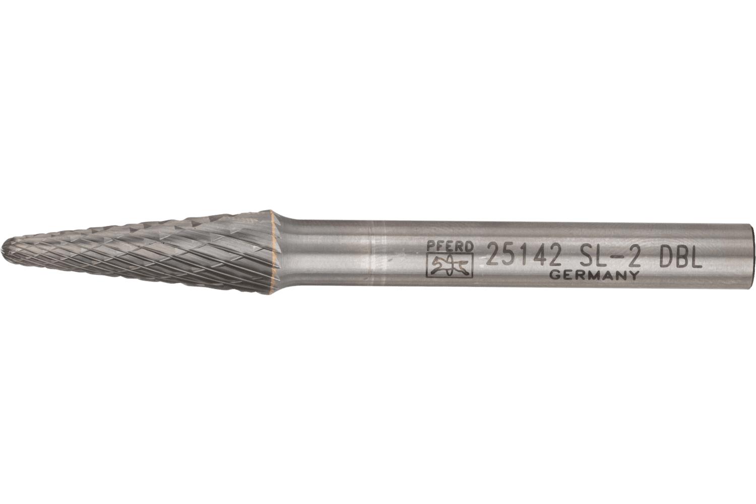 PFERD Carbide Burr, Premium Grade, Series: Universal Line, Radius, 5/16 in Head Dia, 7/8 in Length of Cut, 2-13/16 in Overall Length, Taper Head Shape, Double Cut Type, 1/4 in Shank Dia, 1-15/16 in Shank Length, Tungsten Carbide Head, Bright Head Coating, 14 deg Included Angle, 36000 rpm Maximum, Applicable Materials: Cast Iron, Cast Steel, Non-Ferrous Metals, Steel and Stainless Steel, SL-2 Industry Specification