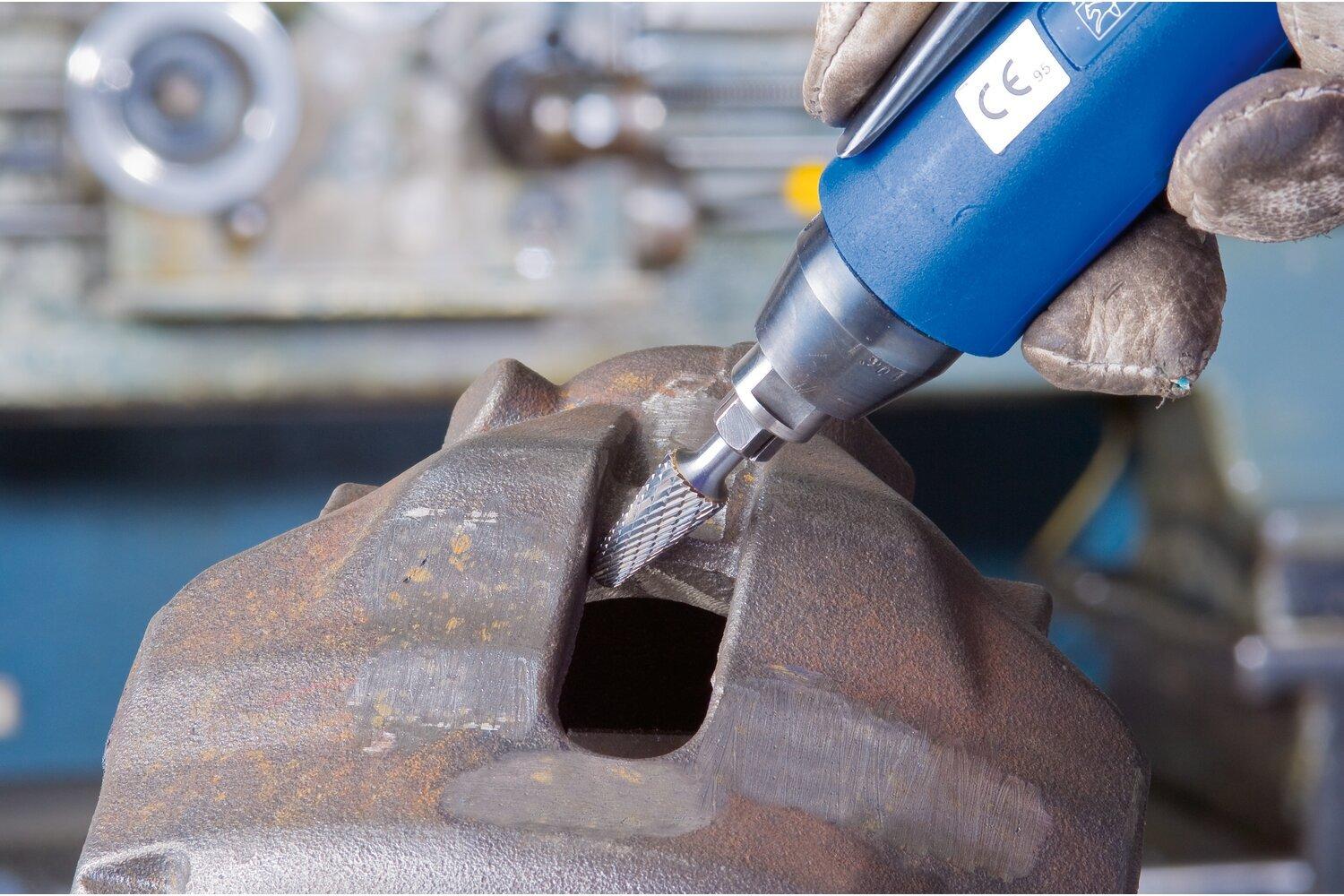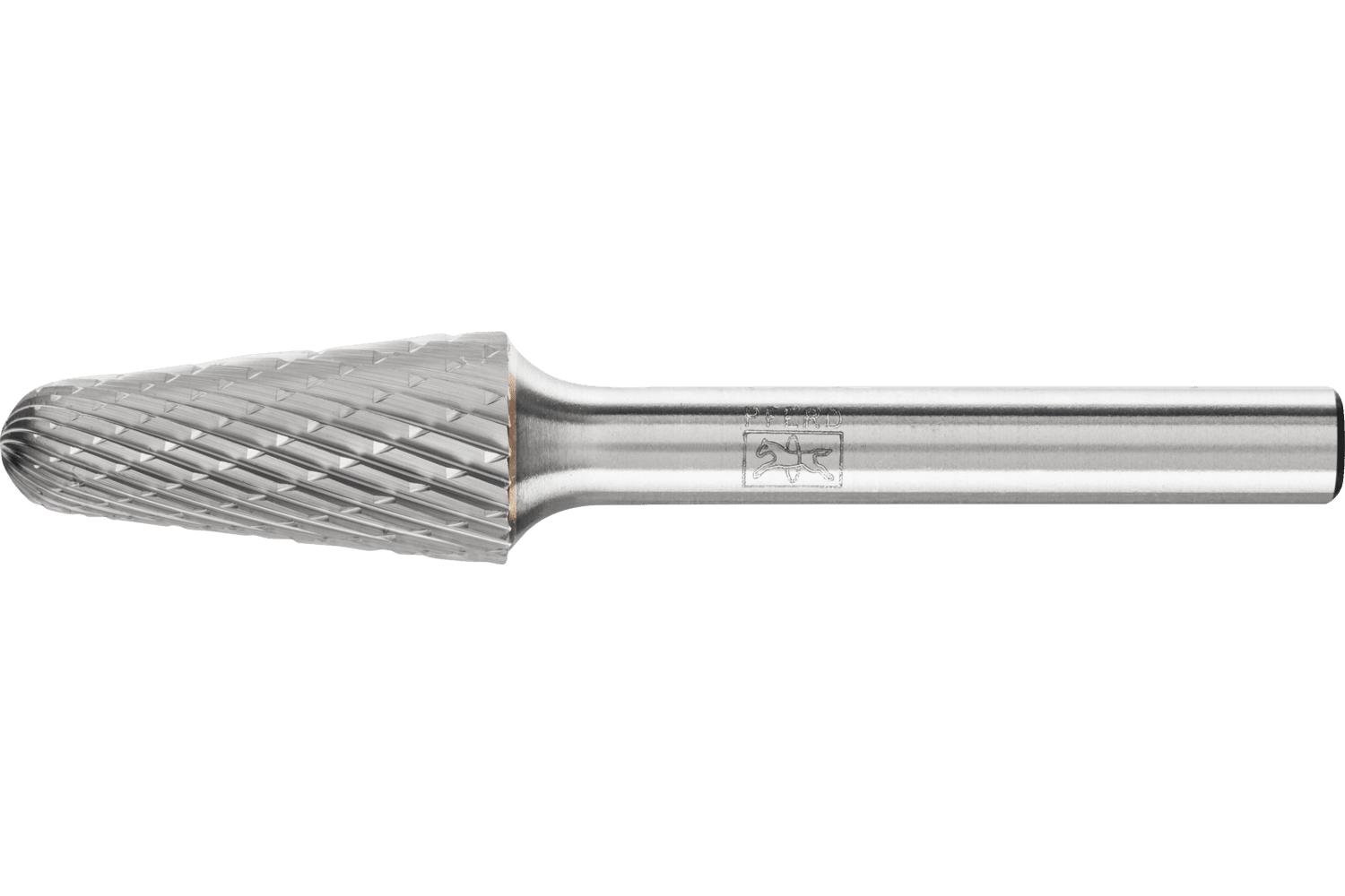 PFERD Carbide Burr, Premium Grade, Series: Universal Line, Radius, 1/2 in Head Dia, 1-1/8 in Length of Cut, 3-1/16 in Overall Length, Taper Head Shape, Double Cut Type, 1/4 in Shank Dia, 1-15/16 in Shank Length, Tungsten Carbide Head, Bright Head Coating, 14 deg Included Angle, 24000 rpm Maximum, Applicable Materials: Cast Iron, Cast Steel, Non-Ferrous Metals, Steel and Stainless Steel, SL-4 Industry Specification