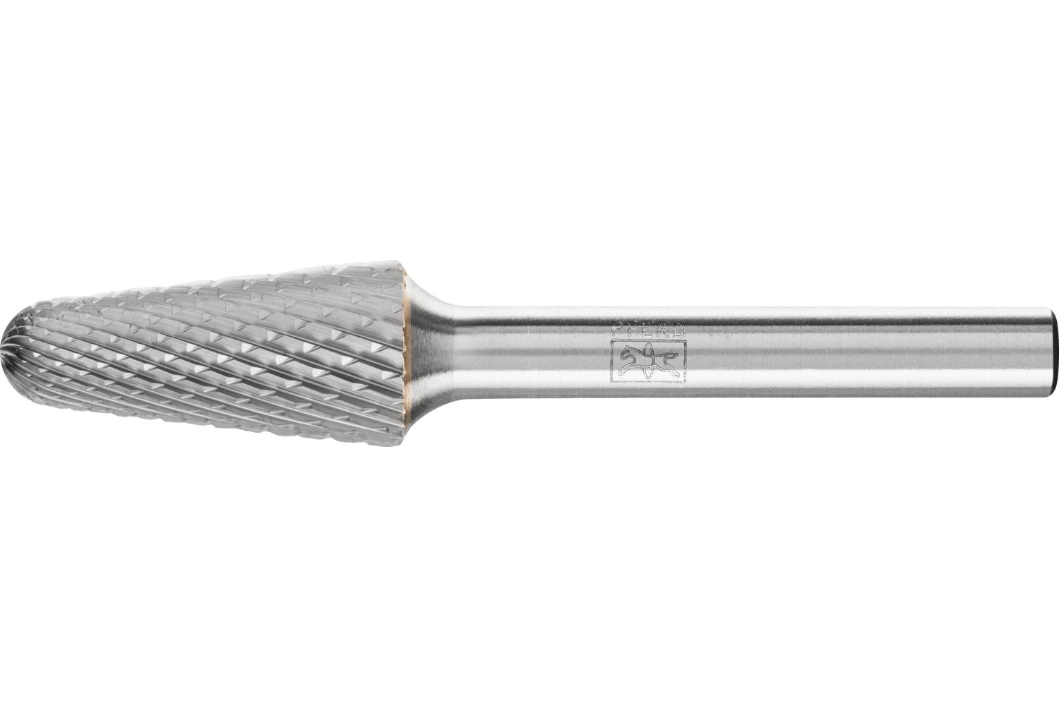 PFERD Carbide Burr, Premium Grade, Series: Universal Line, Radius, 1/2 in Head Dia, 1-1/8 in Length of Cut, 3-1/16 in Overall Length, Taper Head Shape, Double Cut Type, 1/4 in Shank Dia, 1-15/16 in Shank Length, Tungsten Carbide Head, Bright Head Coating, 14 deg Included Angle, 24000 rpm Maximum, Applicable Materials: Cast Iron, Cast Steel, Non-Ferrous Metals, Steel and Stainless Steel, SL-4 Industry Specification