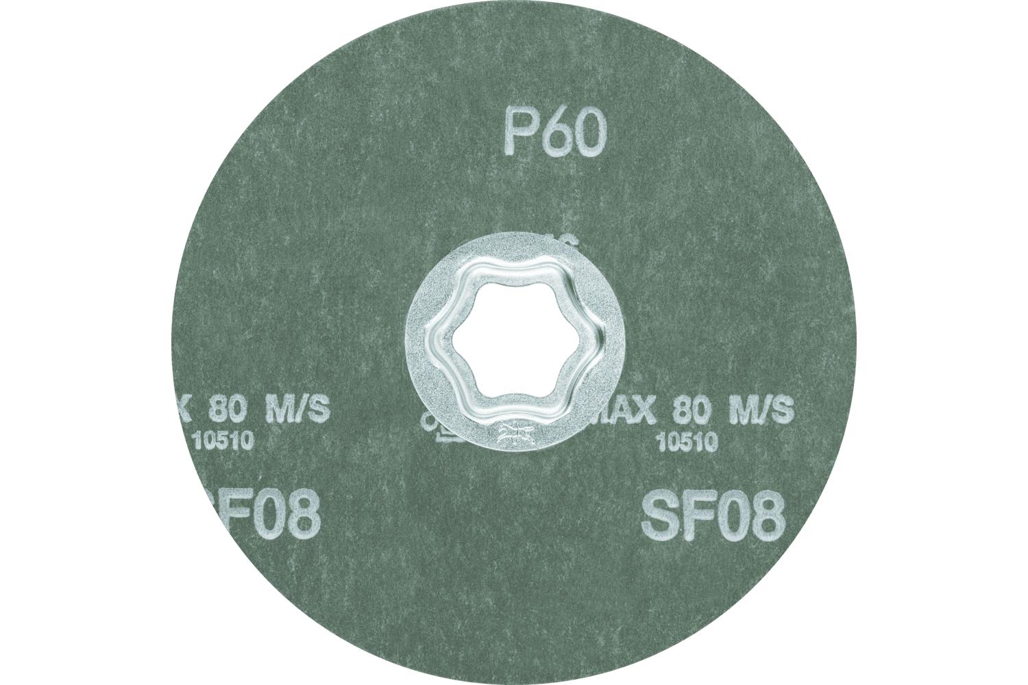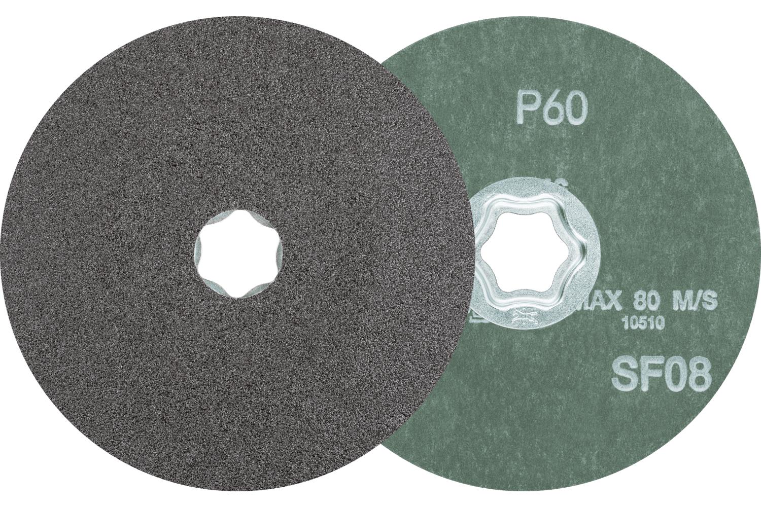 PFERD COMBICLICK® Coated Abrasive Disc, 5 in Diameter Disc, 60 Grit, Silicon Carbide Abrasive, Fiber Backing, Applicable Materials: Aluminum, Copper, Bronze, Titanium, High Alloyed Steel, Fiber Reinforced Plastic and Titanium Alloy, 12200 rpm Maximum
