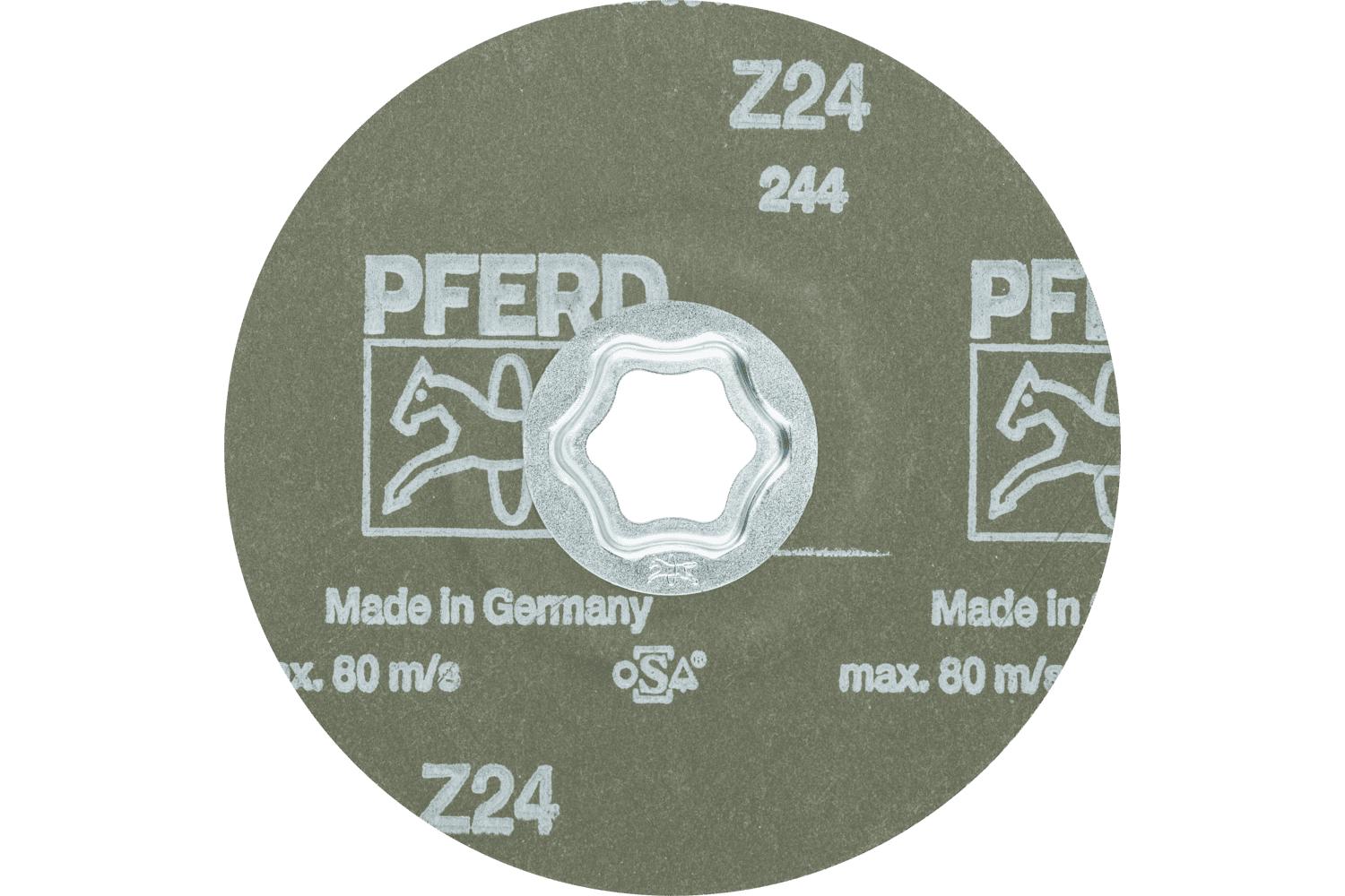 PFERD COMBICLICK® Coated Abrasive Disc, 5 in Diameter Disc, 24 Grit, Zirconia Alumina Abrasive, Fiber Backing, Applicable Materials: Hardened and Heat Treated Steel, 12200 rpm Maximum