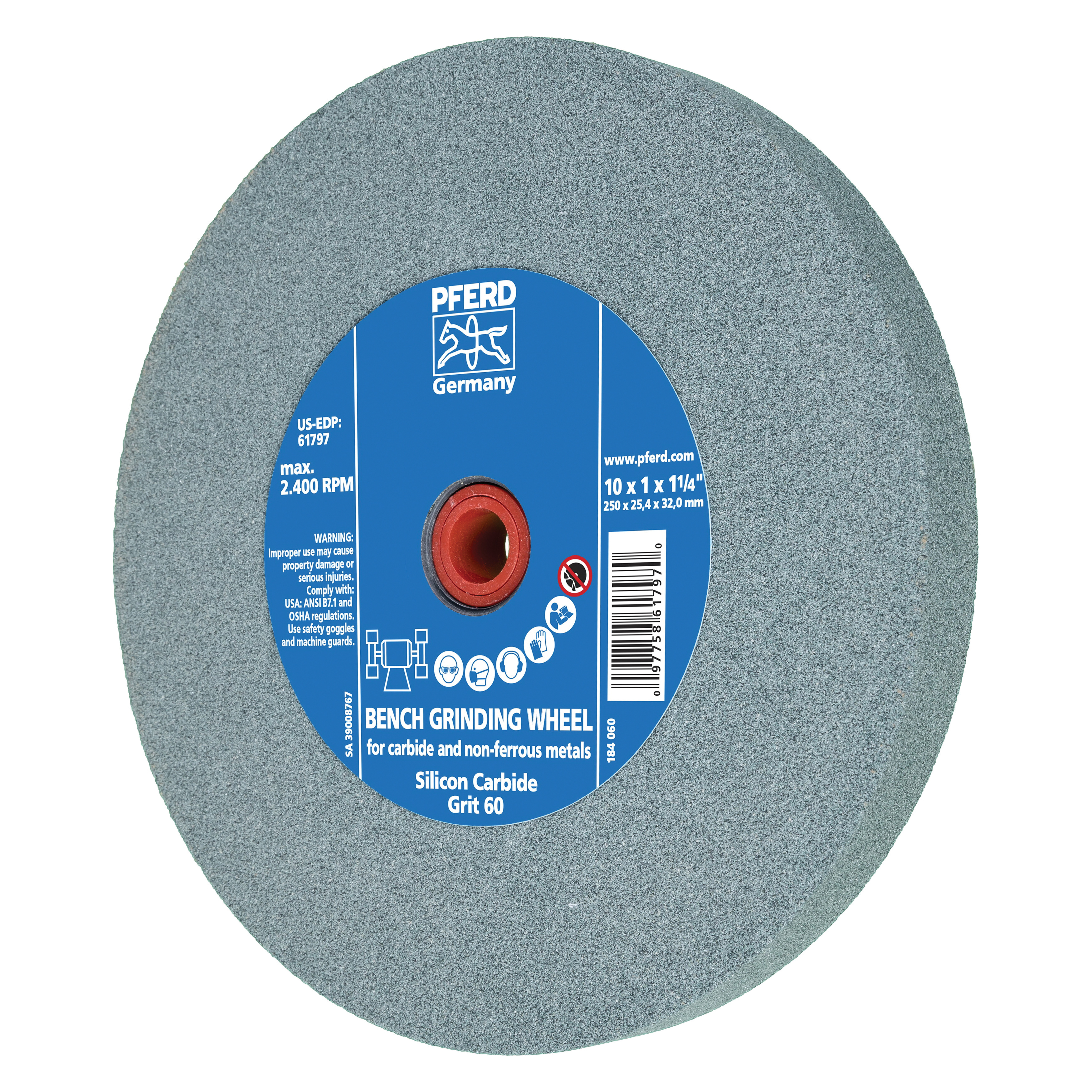PFERD Universal Line PS-FORTE Bench and Pedestal Grinding Wheel, Flat, Series: Universal Line PS-FORTE, 10 in Wheel Dia, 1 in Wheel Thickness, 1-1/4 in Center Hole, 60 Grit, Coarse Grade, Silicon Carbide Abrasive, 2485 rpm Maximum, Vitrified Bond, Green Wheel, Applicable Materials: Carbide, Non-Ferrous Metals and Masonry, Wheel Type Number: Type 1