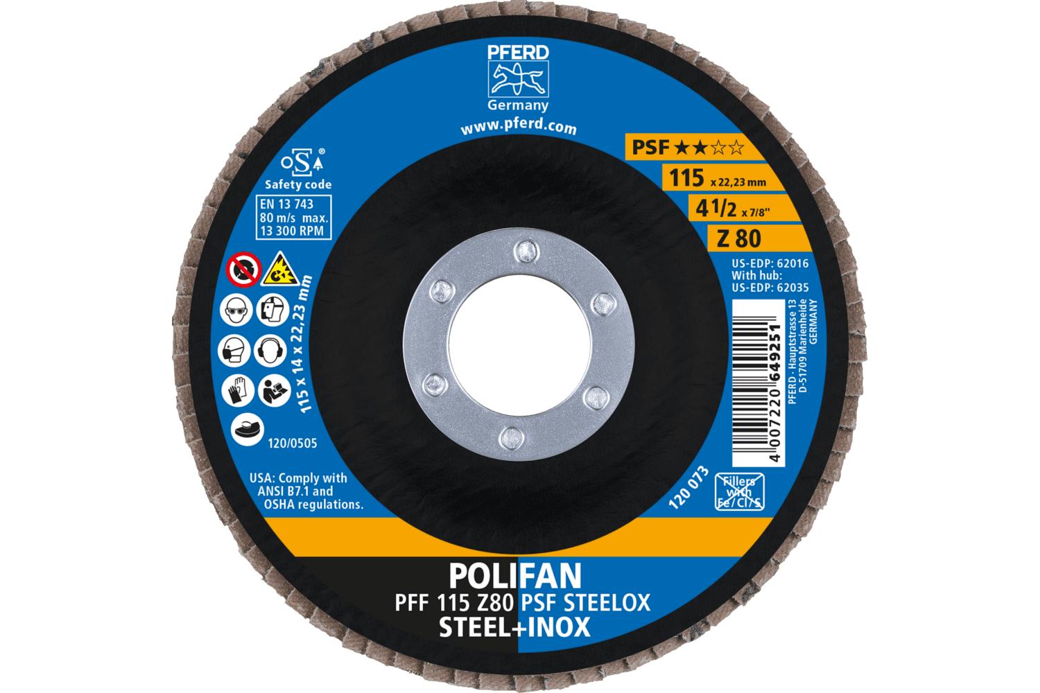PFERD Polifan® Coated Abrasive Flap Disc, Unthreaded, Series: Universal Line PSF-Z, 4-1/2 in Disc Dia, 7/8 in Center Hole, 80 Grit, Zirconia Alumina Abrasive, Type 27 Flat Disc, Cloth Backing, 13300 rpm Maximum